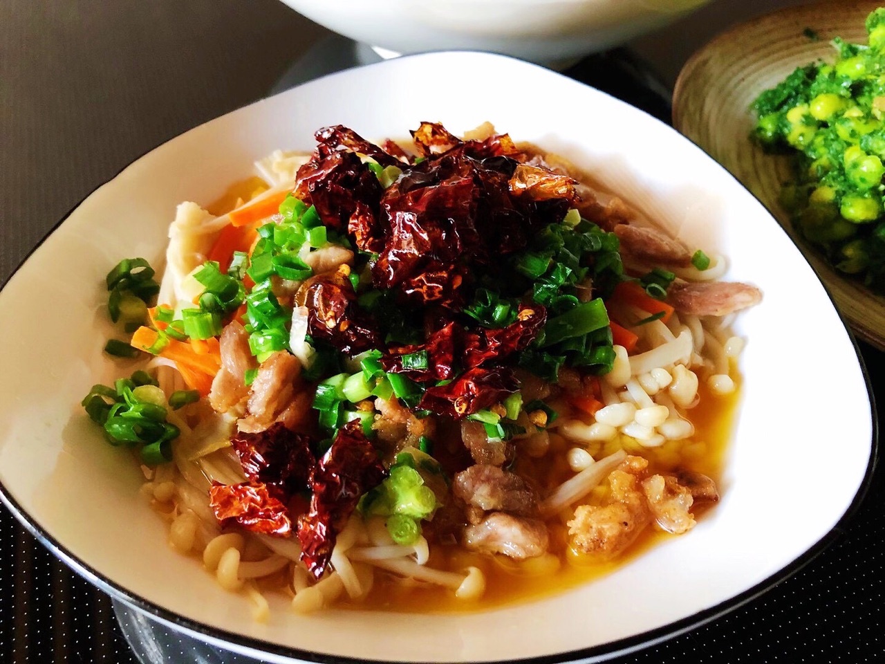 辅料:干辣椒2条、榨菜1小包、五花肉15-20克、盐0.5-1克、食用油20-25克左右、胡萝卜10-15克