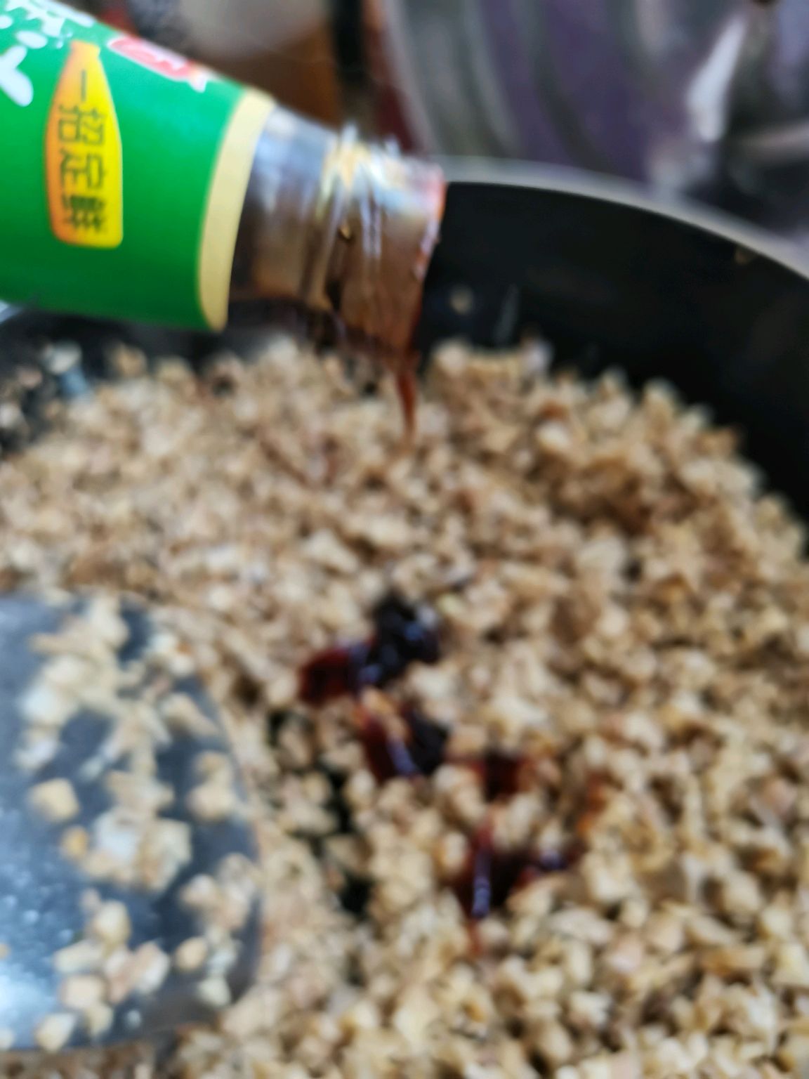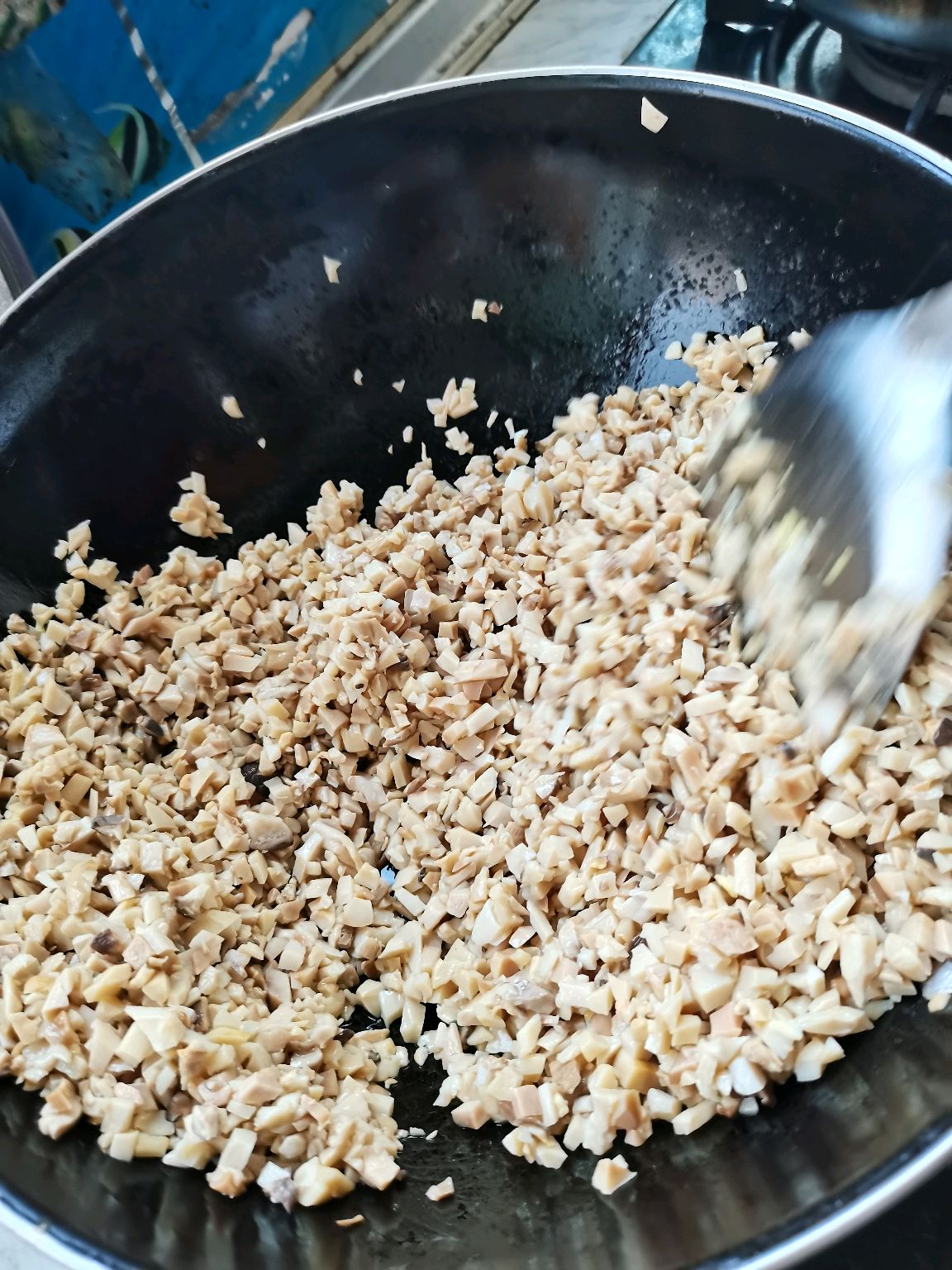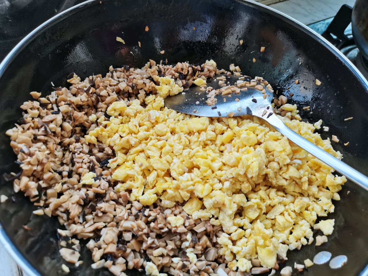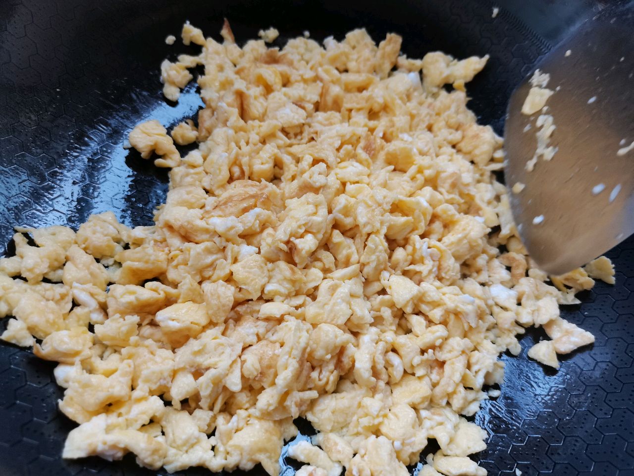 步骤6、锅中加入油,放入鸡蛋翻炒。炒熟后,把鸡蛋切成小丁。