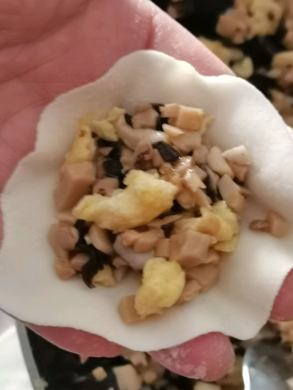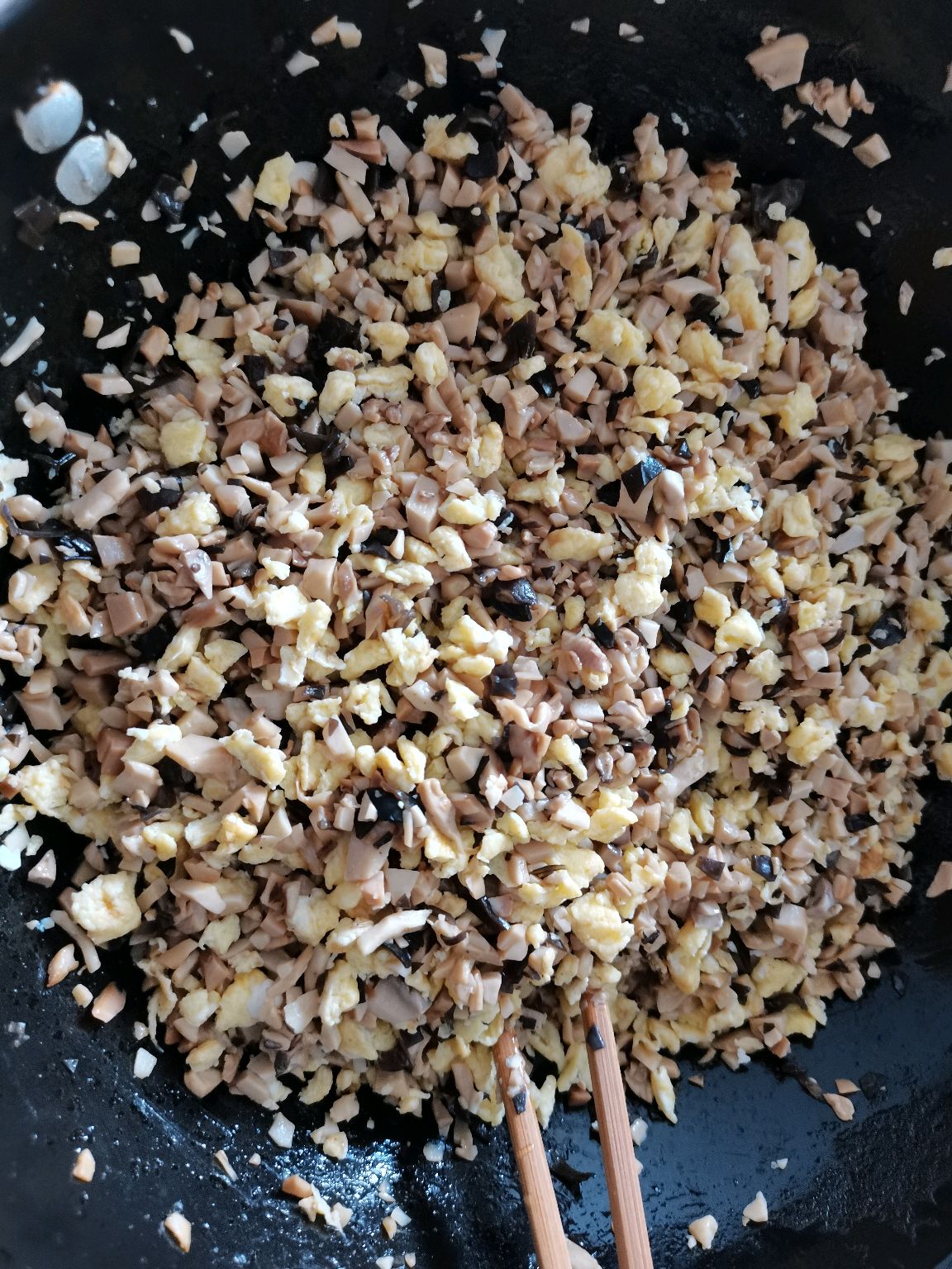 辅料:水适量、饺子馅:、杏鲍菇6个、黑木耳适量、鸡蛋6个、盐适量、蚝油适量、食用油适量、香油少许