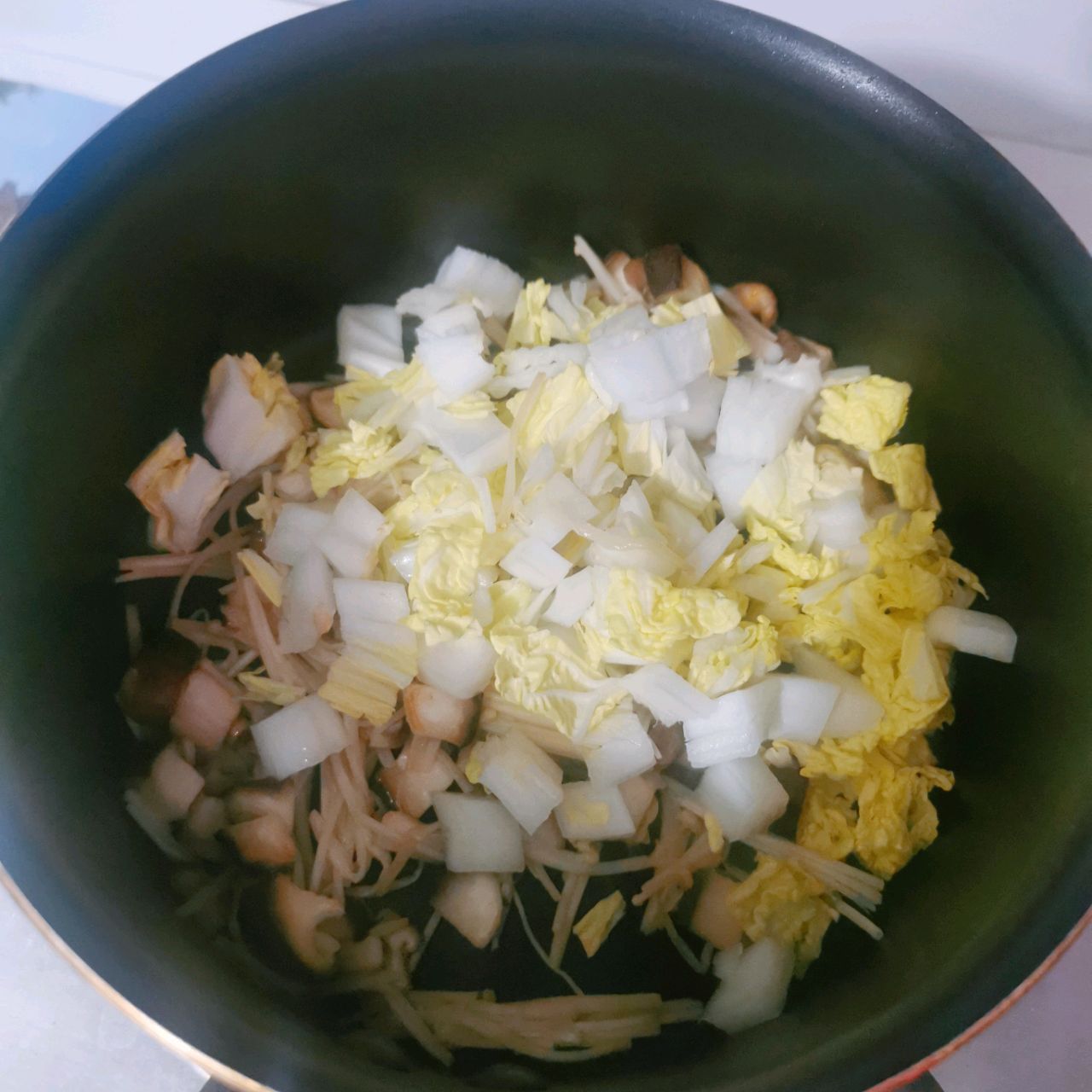 步骤2、锅中放适量核桃油,加入香菇和金针菇炒软