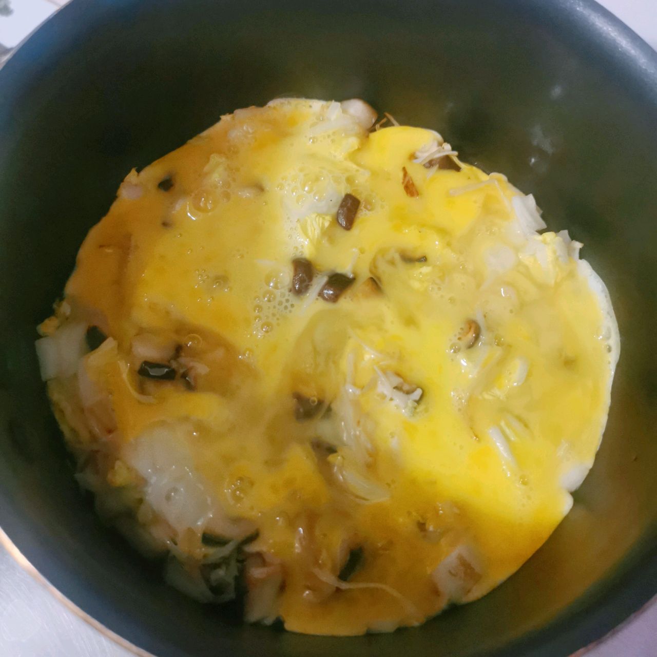 步骤1、香菇洗净切粒,金针菇洗净切段,娃娃菜切块,鸡蛋打散备用