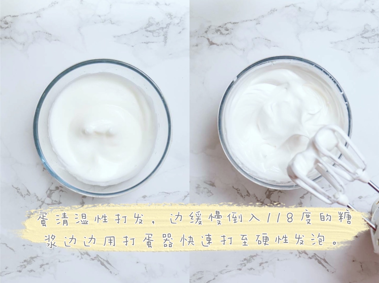 步骤3、用电动打蛋器打发蛋清和10克细砂糖至湿性打发。边用打蛋器高速搅拌蛋白,边缓慢加入熬好的糖水,至蛋白霜为硬性打发。