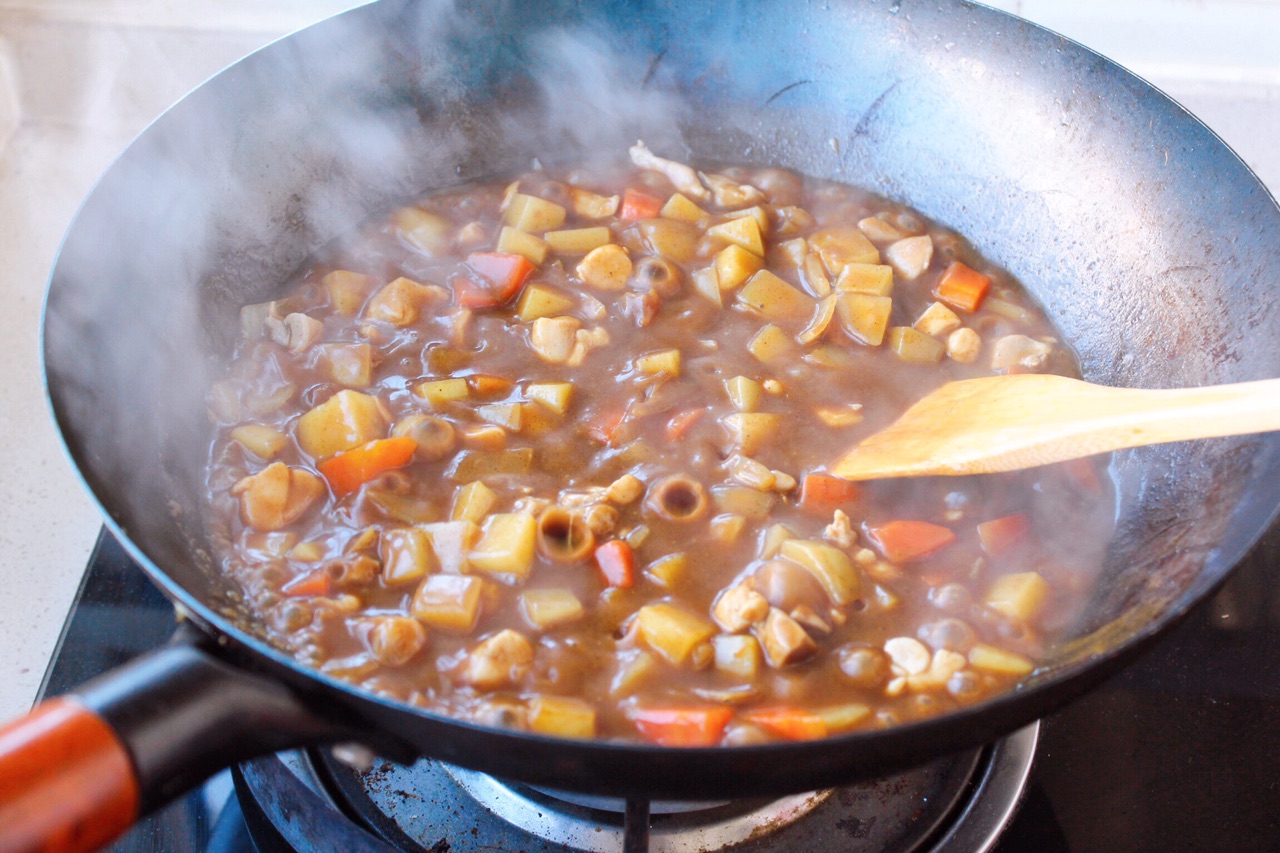 步骤9、打开包装再掰开咖喱块放入菜中融化;