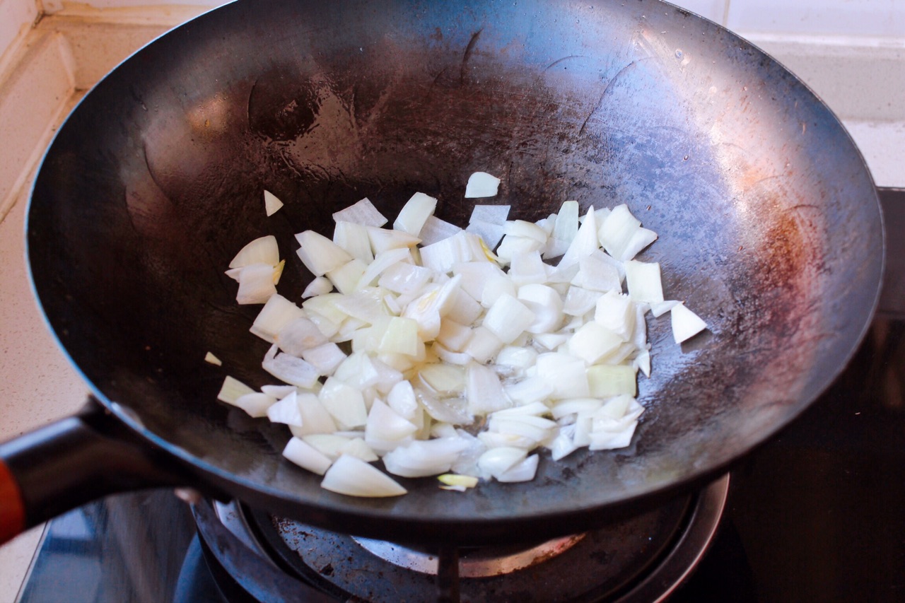 步骤3、锅中倒入适量食用油,倒入洋葱块炒至透明;