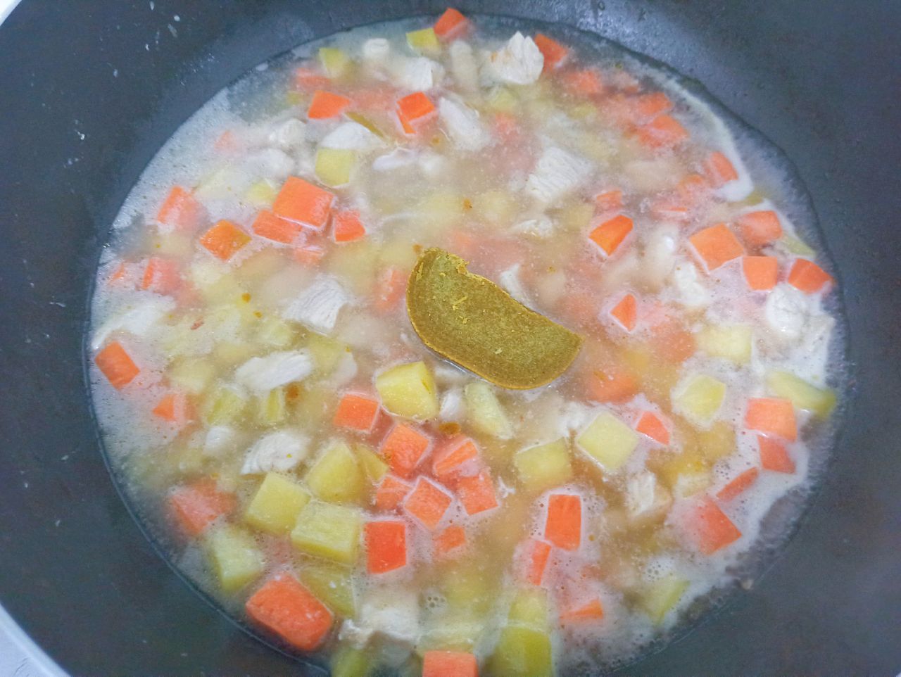 步骤4、锅内放入适量油加入鸡胸肉炒至变色,再加入土豆胡萝卜翻炒到稍微变软