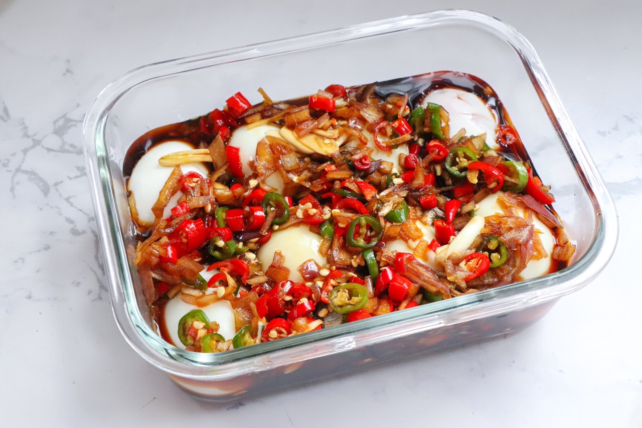 步骤7、倒入调好的酱汁,盖上盖子密封冰箱冷藏一晚就可以吃了