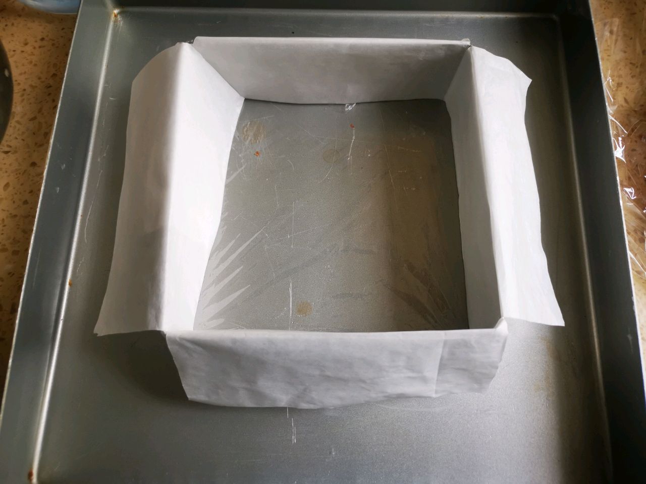步骤1、将模具先准备好。我为了好看,用的方慕斯圈,底部用保鲜膜包住,四周也用围边包起来。但事实证明,这款非常好脱模。随便一个碗就行