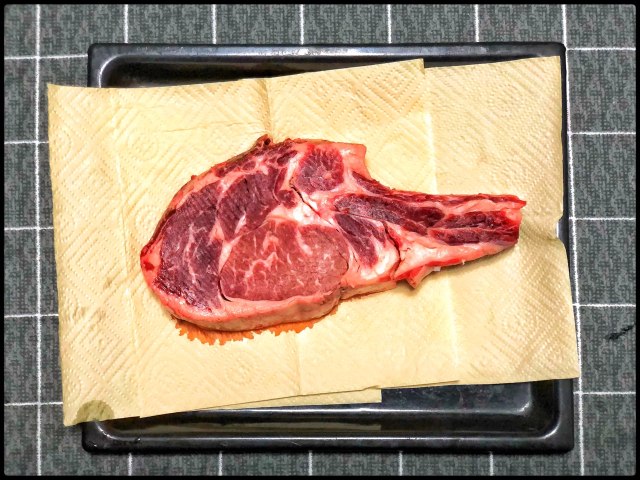 步骤1、战斧牛排在室温下完全解冻后用厨房用纸吸去牛排表面血水。