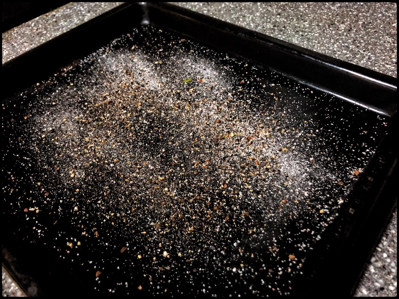 步骤2、盘子底部撒适量的现磨黑胡椒碎和玫瑰盐。