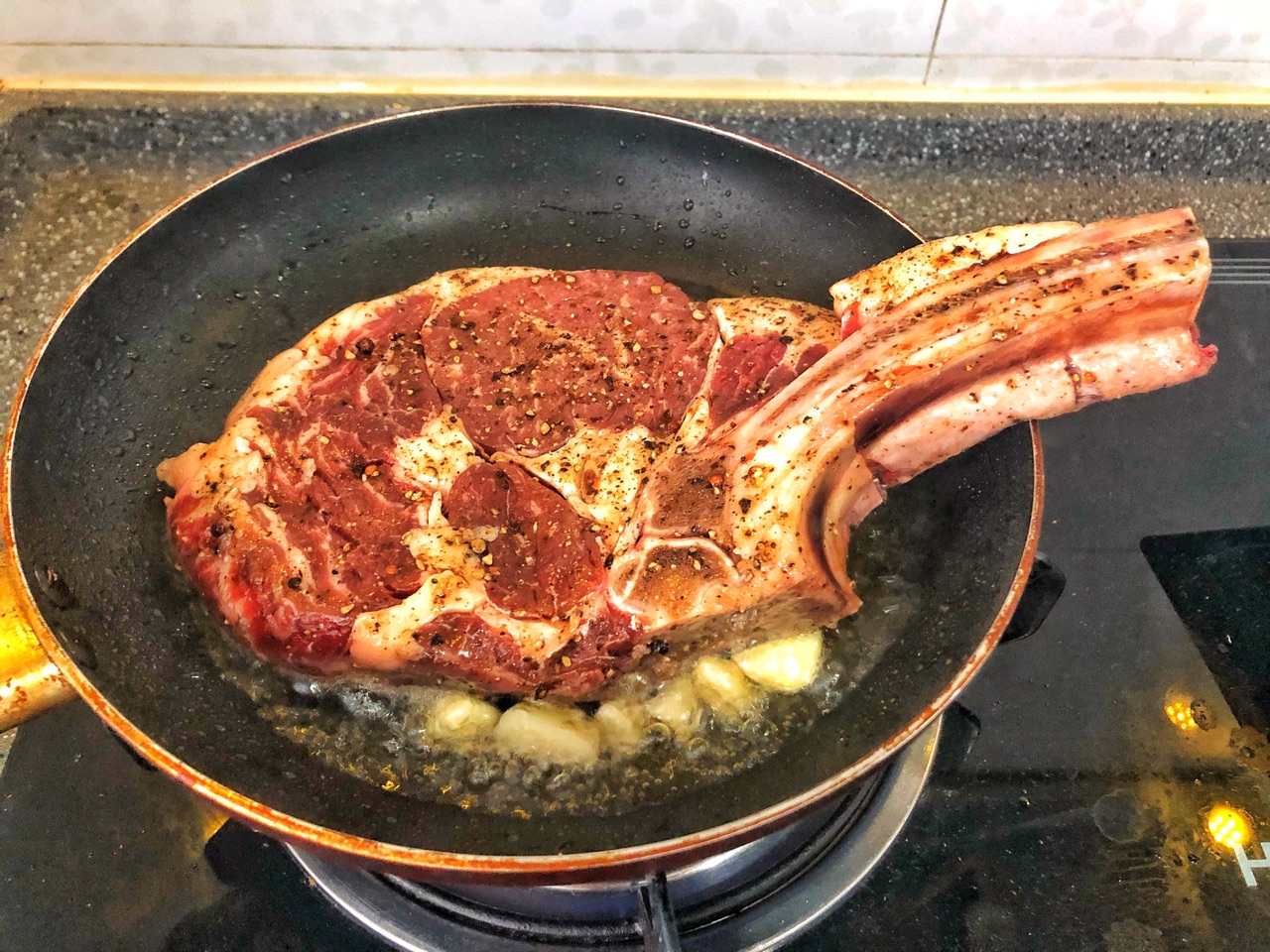 步骤7、植物油保持大火加热大约三十秒后投入大蒜粒,紧接着放入牛排煎。单面的油煎时间不要超过两分钟,同时用一个小勺往无法被油煎到的部位淋上热油。