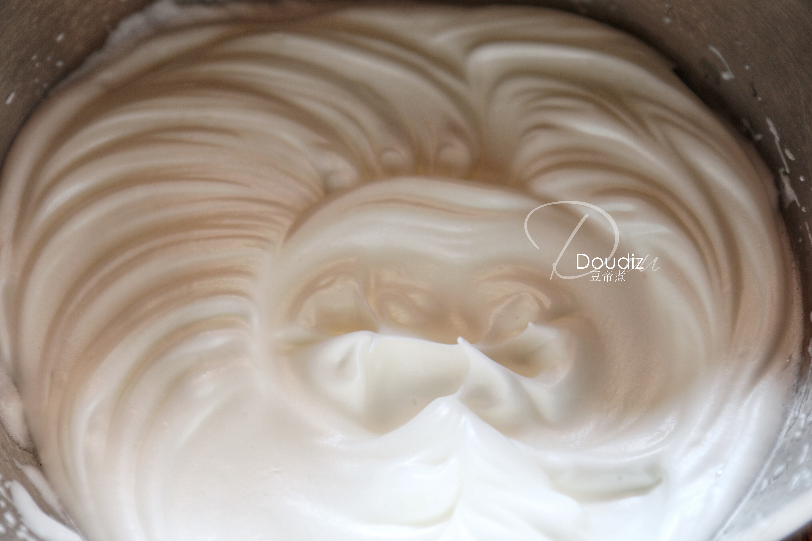 步骤3、在蛋白液里加入两滴的柠檬汁或者是香草精帮助去除蛋腥味,接着用电动打蛋器快速搅打至鱼眼发泡加入二分之一的细砂糖。搅打至蛋液有纹理倒入最后的细砂糖,继续搅打至湿性发泡即提起有个弯角。