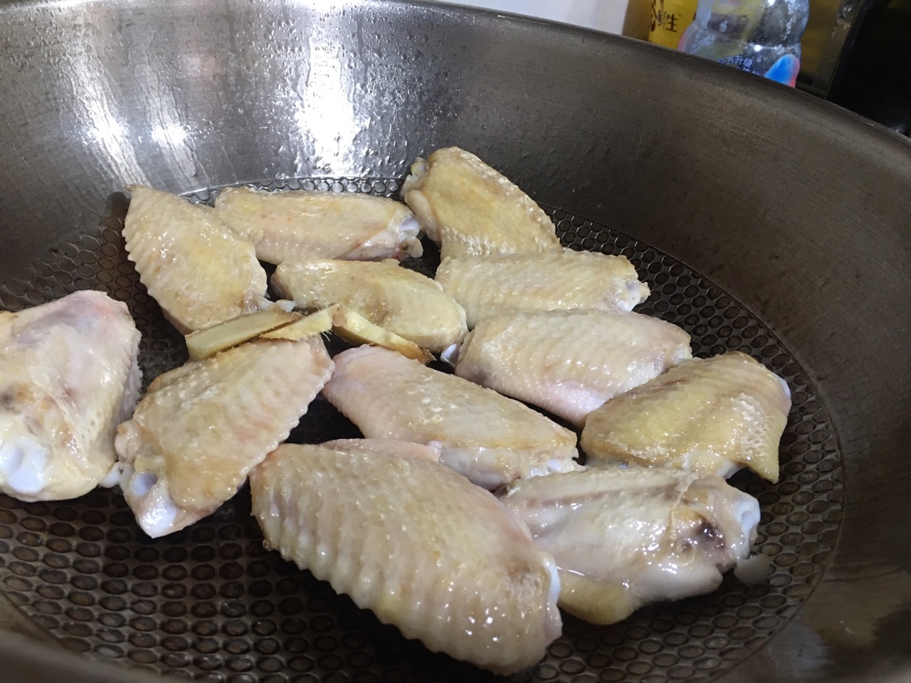 步骤2、锅里两勺油煎鸡翅,双面煎煎,放入姜片