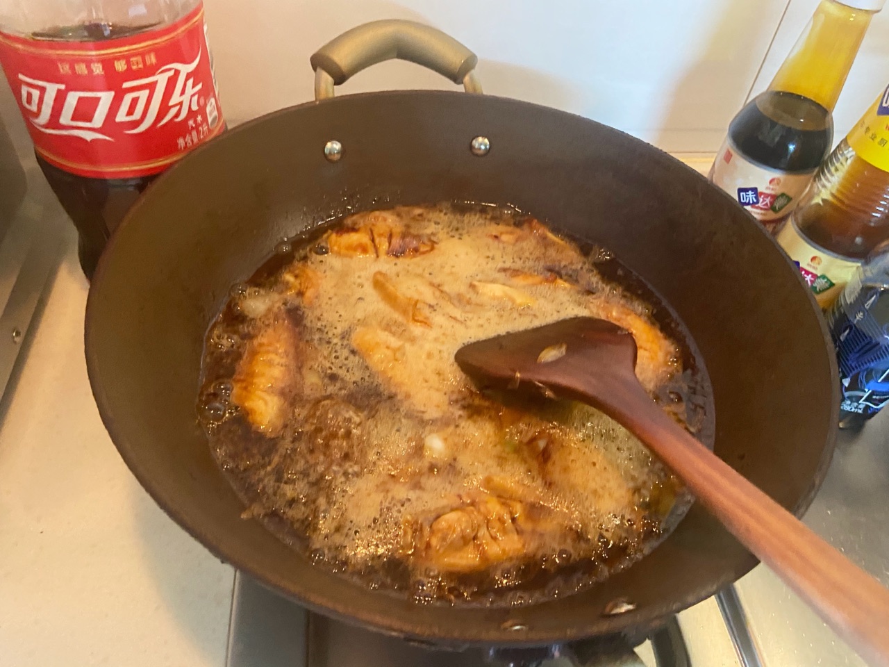 步骤5、翻炒均匀的鸡翅倒入可口可乐,可乐没过鸡翅即可。500ml的可乐差不多就够了,我买了一大瓶,用不完自己喝。(搅拌一下、以免粘锅底)