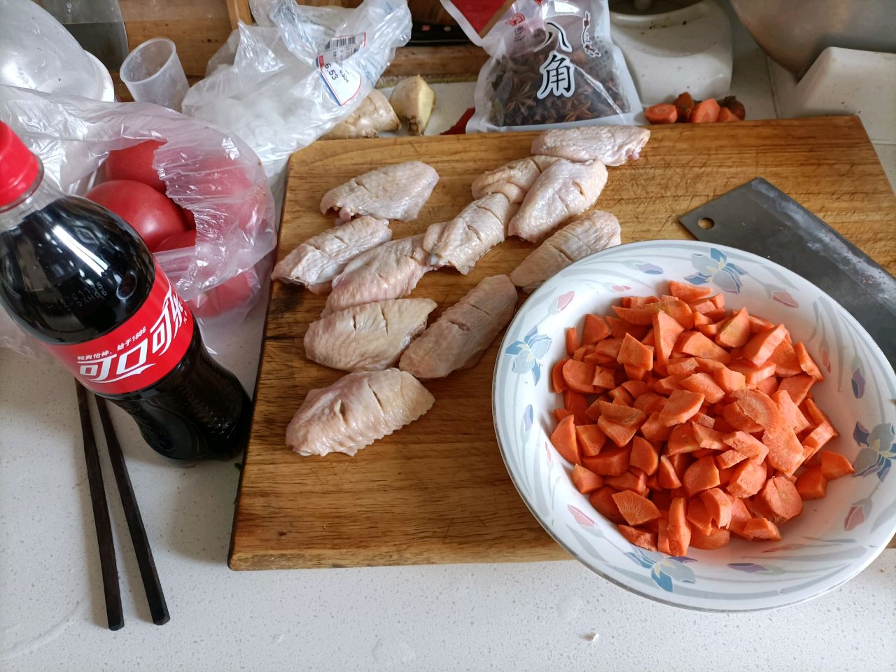 步骤3、把油倒入锅中,油热后,放入姜蒜爆炒,煸出蒜香,把鸡翅倒入锅中,加入3个八角,加入适量水没过鸡翅,把胡萝卜片倒入锅中。加入300ml可乐,适量酱油,一勺盐,大火加热5分钟,转至中火慢慢炖。