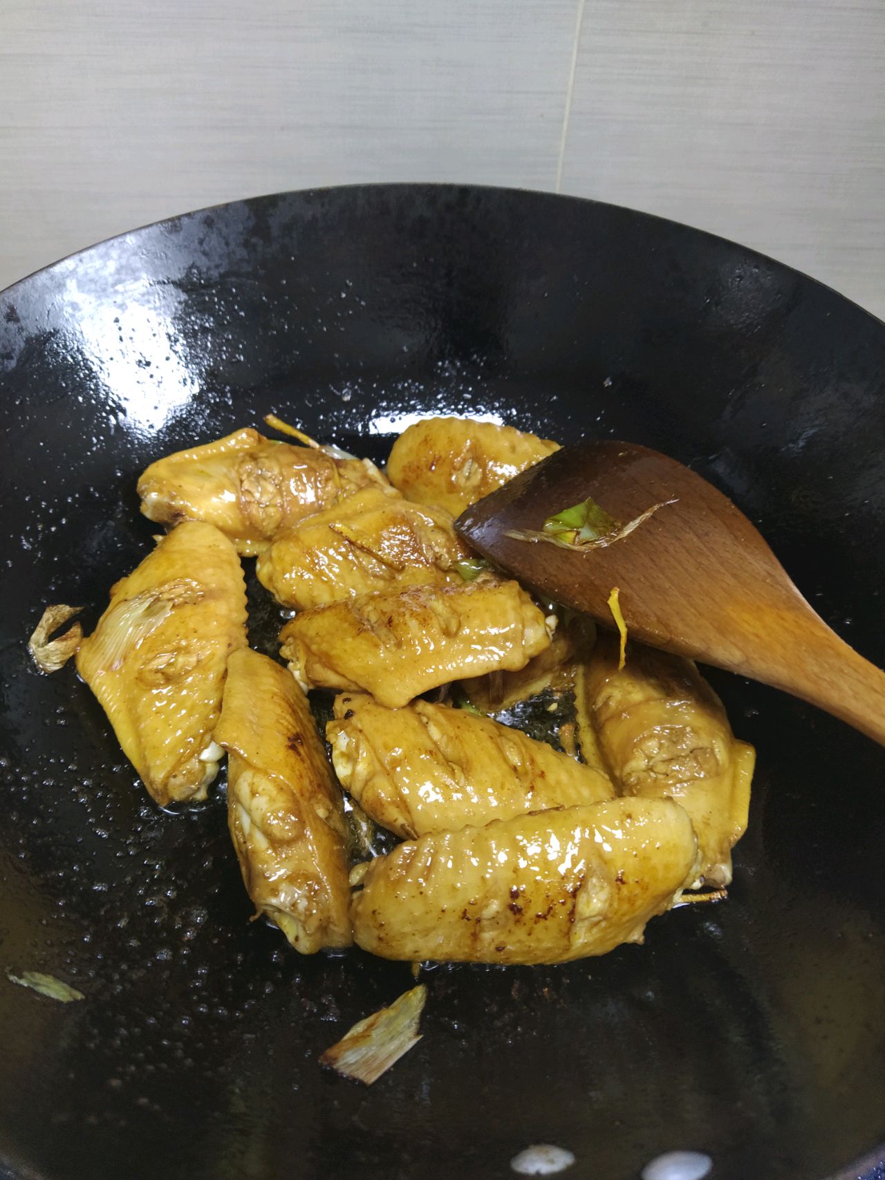 步骤5、炒到鸡翅变色,变成漂亮的金黄色。