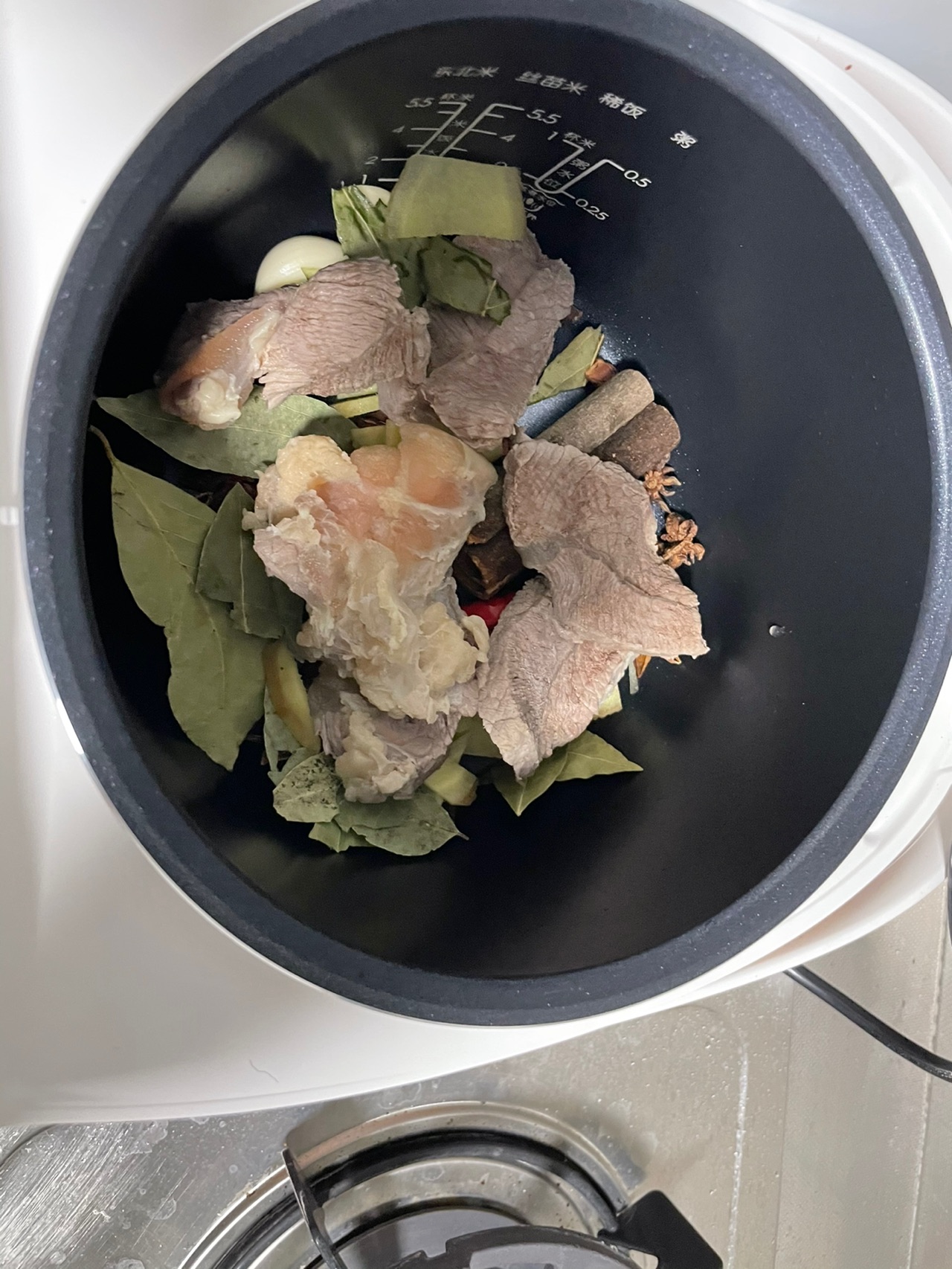 步骤5、电饭煲先把料放进去再放牛肉再把其他肉类都放进去