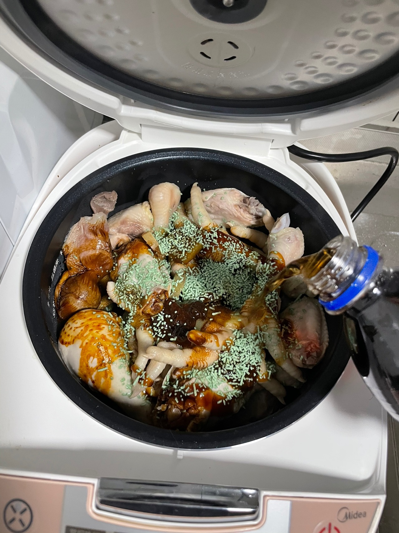 步骤7、说明下绿色的是太太乐蔬之鲜。全部放进去后放可乐,我这锅其实600毫升有点少,建议根据锅的情况买大升的可乐,饮料要盖过所有的食物