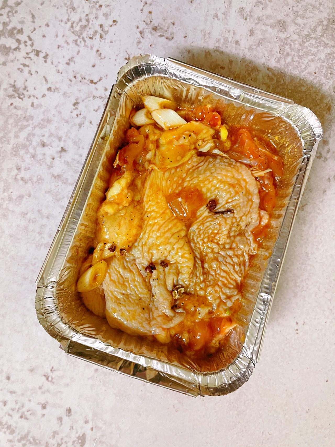 步骤1、鸡腿用厨房剪刀剔掉骨头,放入锡盒里,加入所有调料。