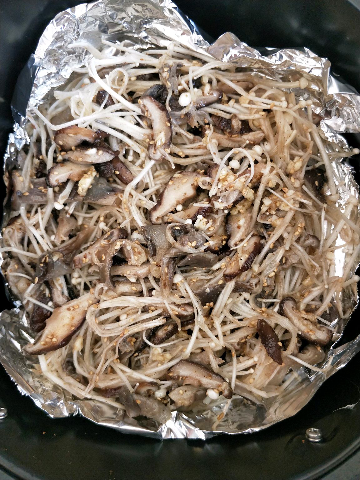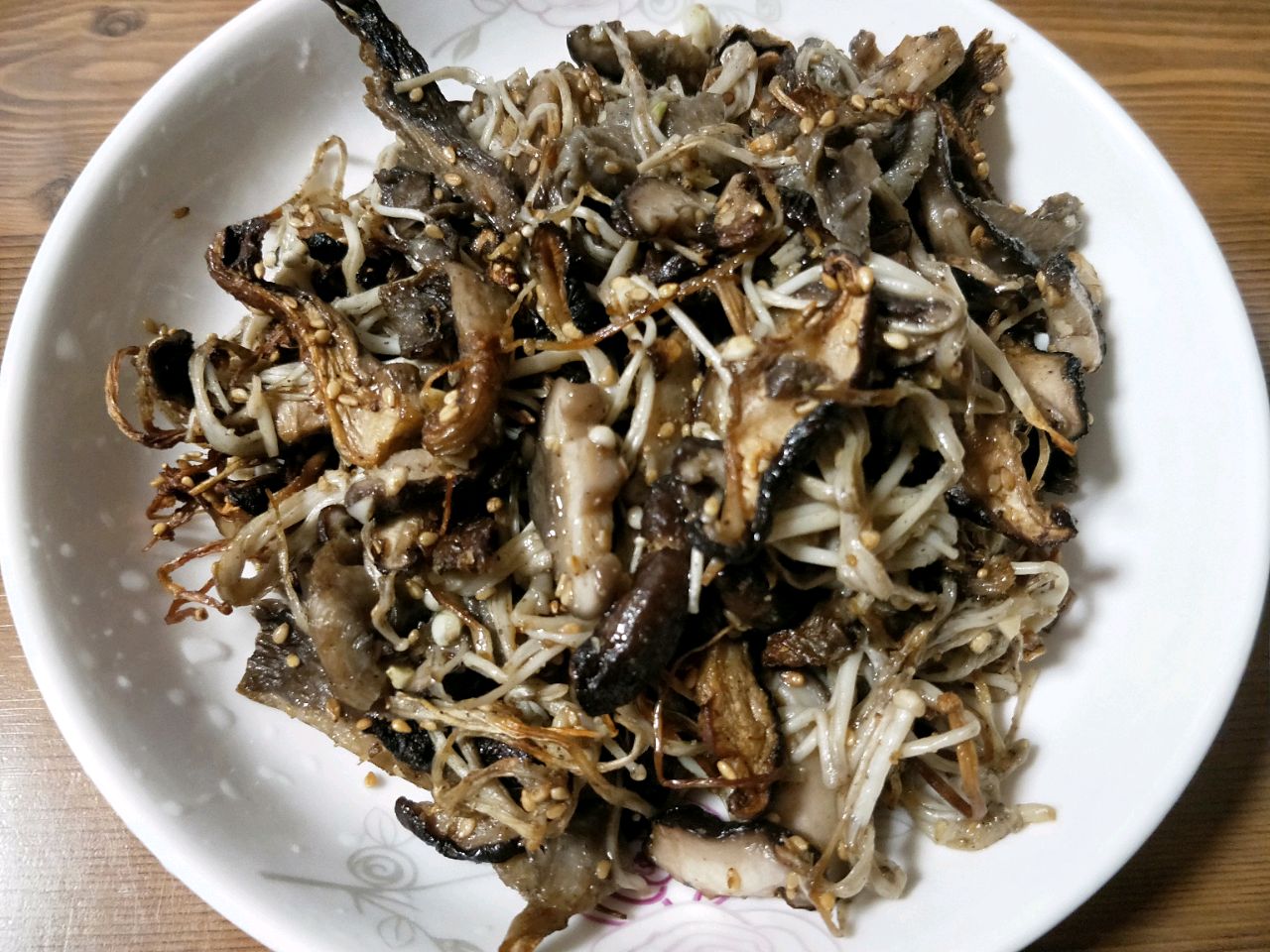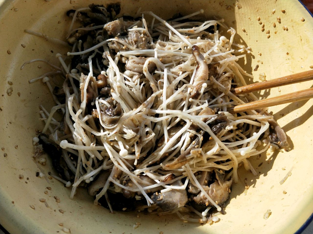 辅料:金针菇一小包、蒜末适量、白芝麻适量、黑胡椒适量、孜然适量、食盐适量、耗油适量、食用油少许、白砂糖少许