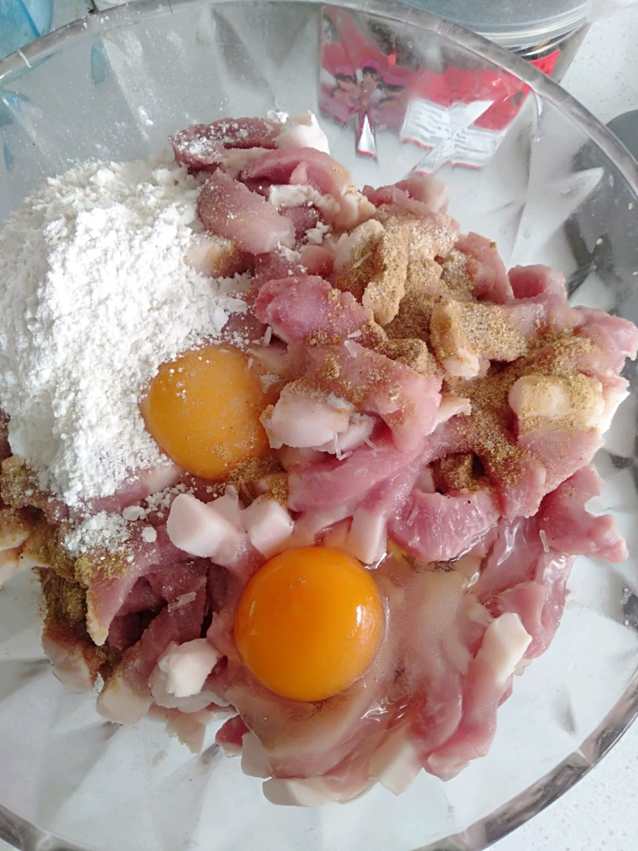 步骤2、倒入面粉,两个鸡蛋,十三香,盐,