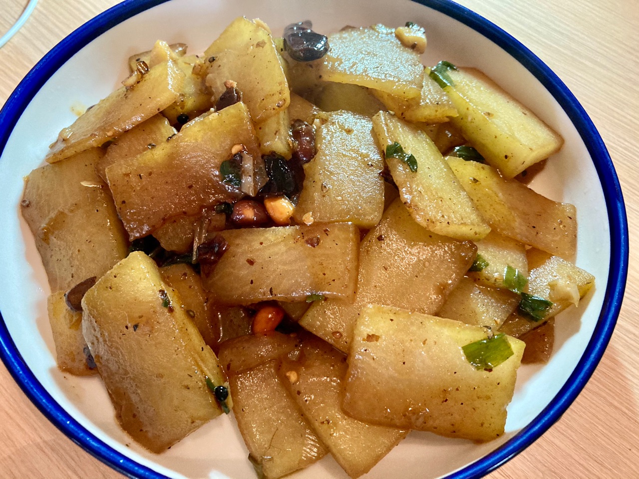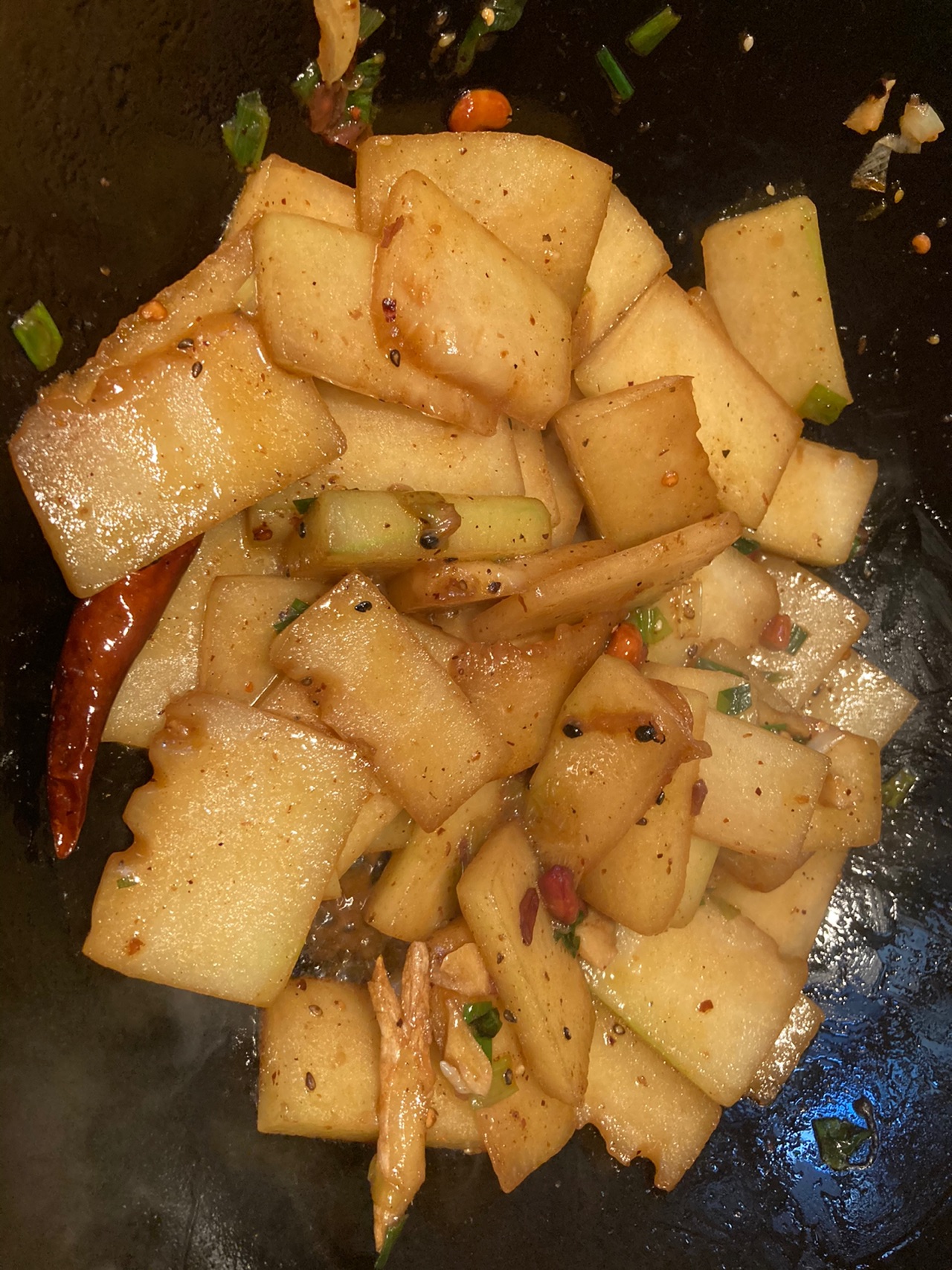 步骤4、加入少许水,盐,炖一会直至水差不多熬干,撒些鸡精出锅。