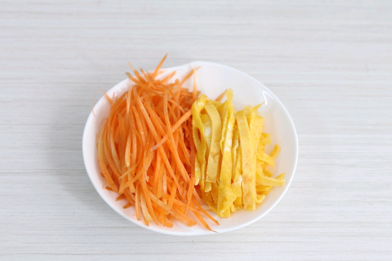 辅料:韭菜150克、鸡蛋1个、胡萝卜1个、酱油适量、油适量