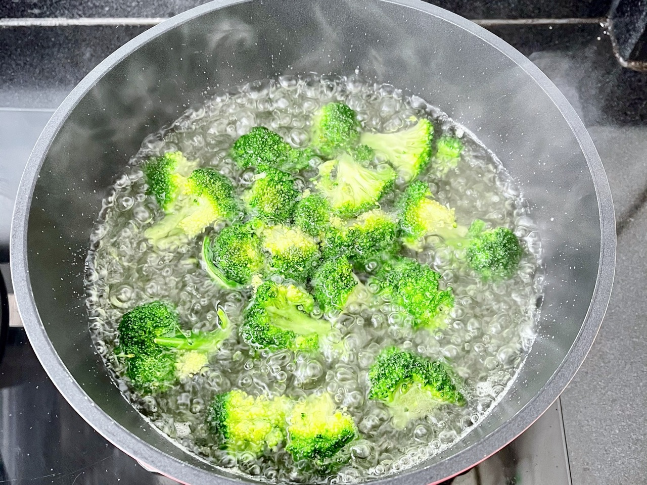 步骤2、西兰花撕小朵,锅中倒入适量的清水,加入少许盐和食用油,把西兰花倒入锅中开始焯水。