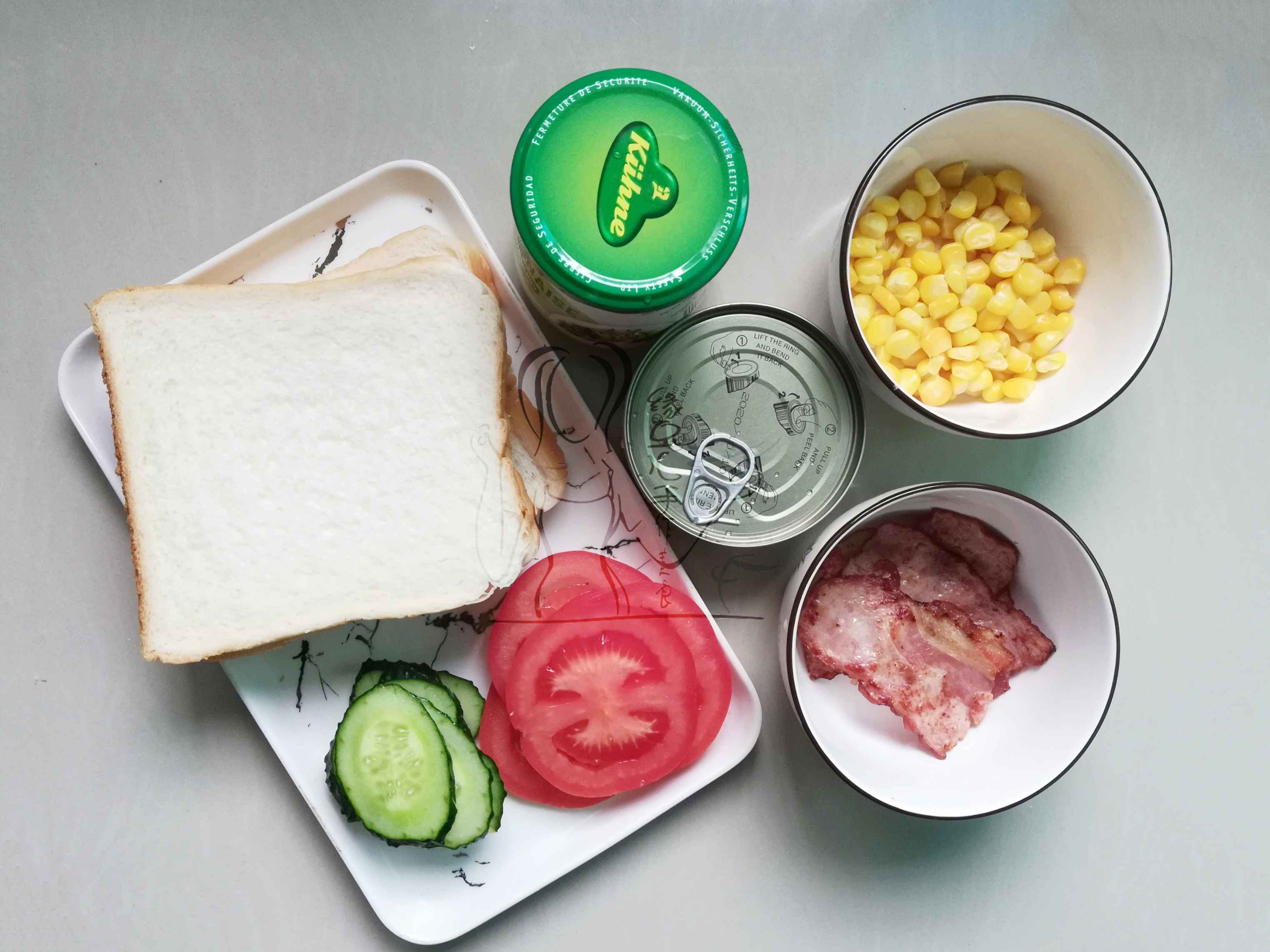 辅料:熟玉米粒1勺、培根8小片、番茄片4片、黄瓜片4片、香草蛋黄酱适量