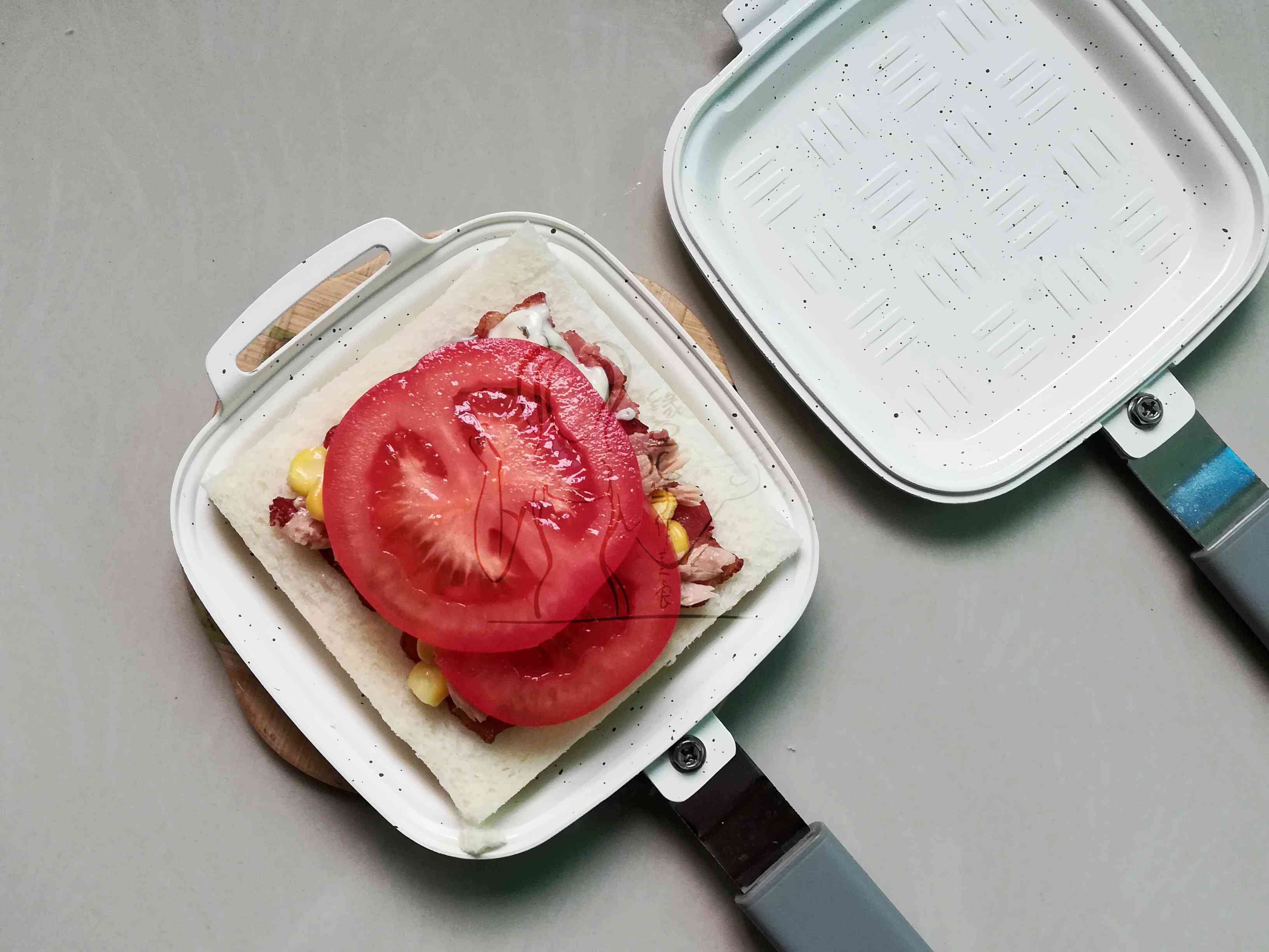 步骤4、三明治盘擦干净,先放上面包片再培根、蛋黄酱还玉米和金枪鱼,再放上番茄片或黄瓜片,然后重复一层,