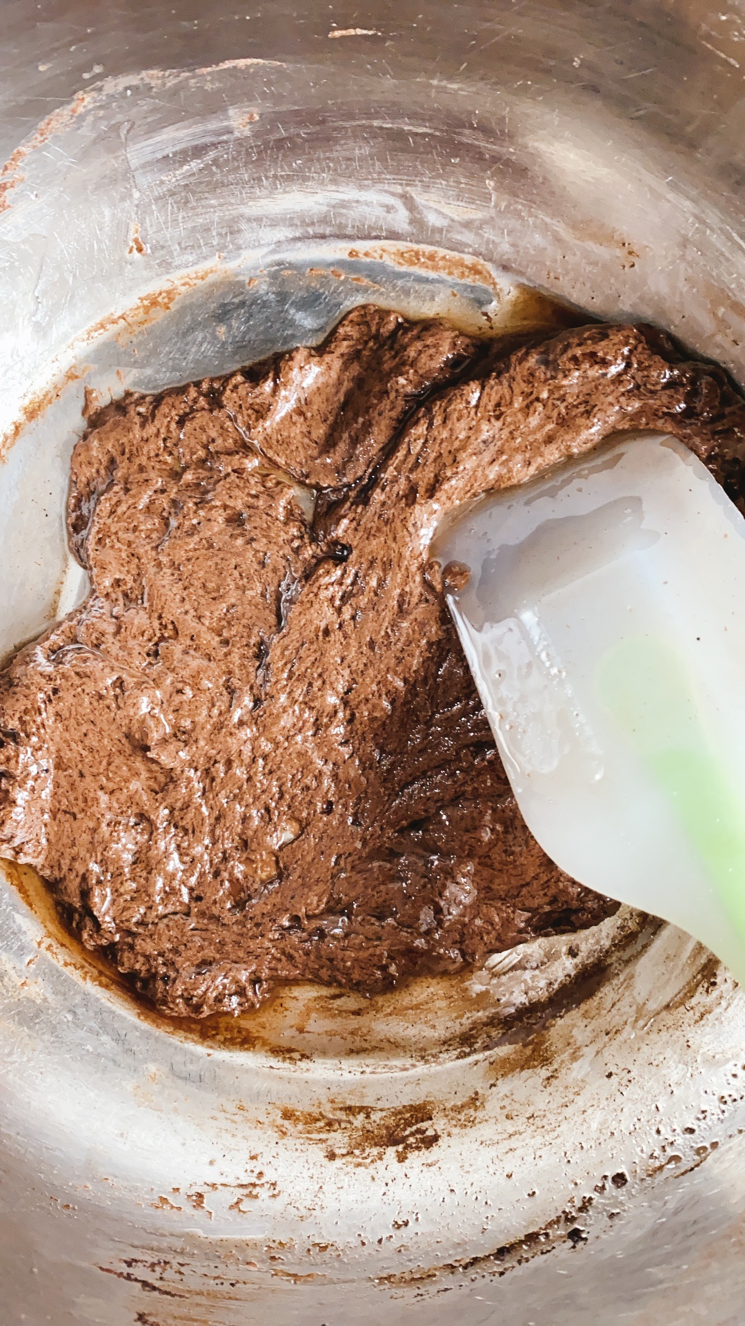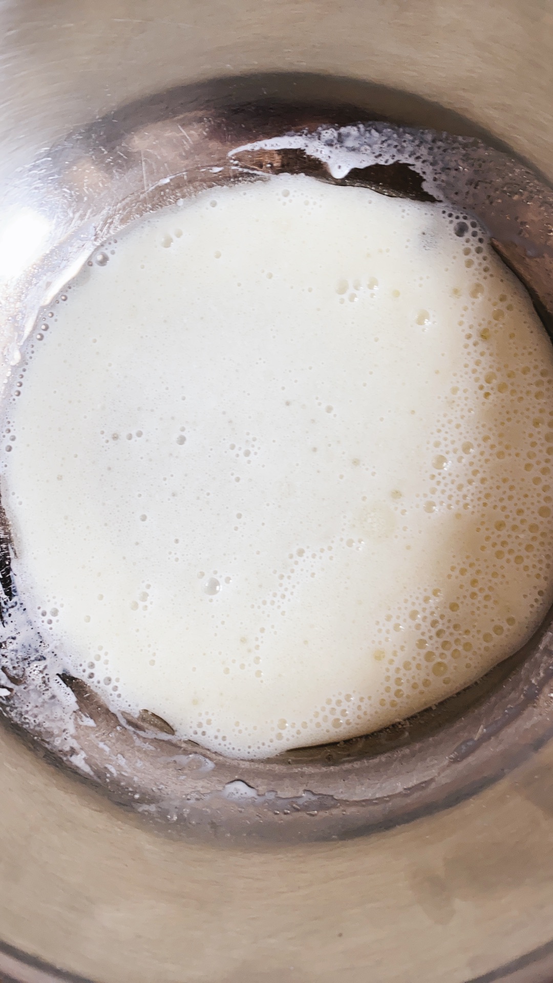 步骤4、可可蛋糕卷部分:45g玉米油+50g纯牛奶搅拌乳化。