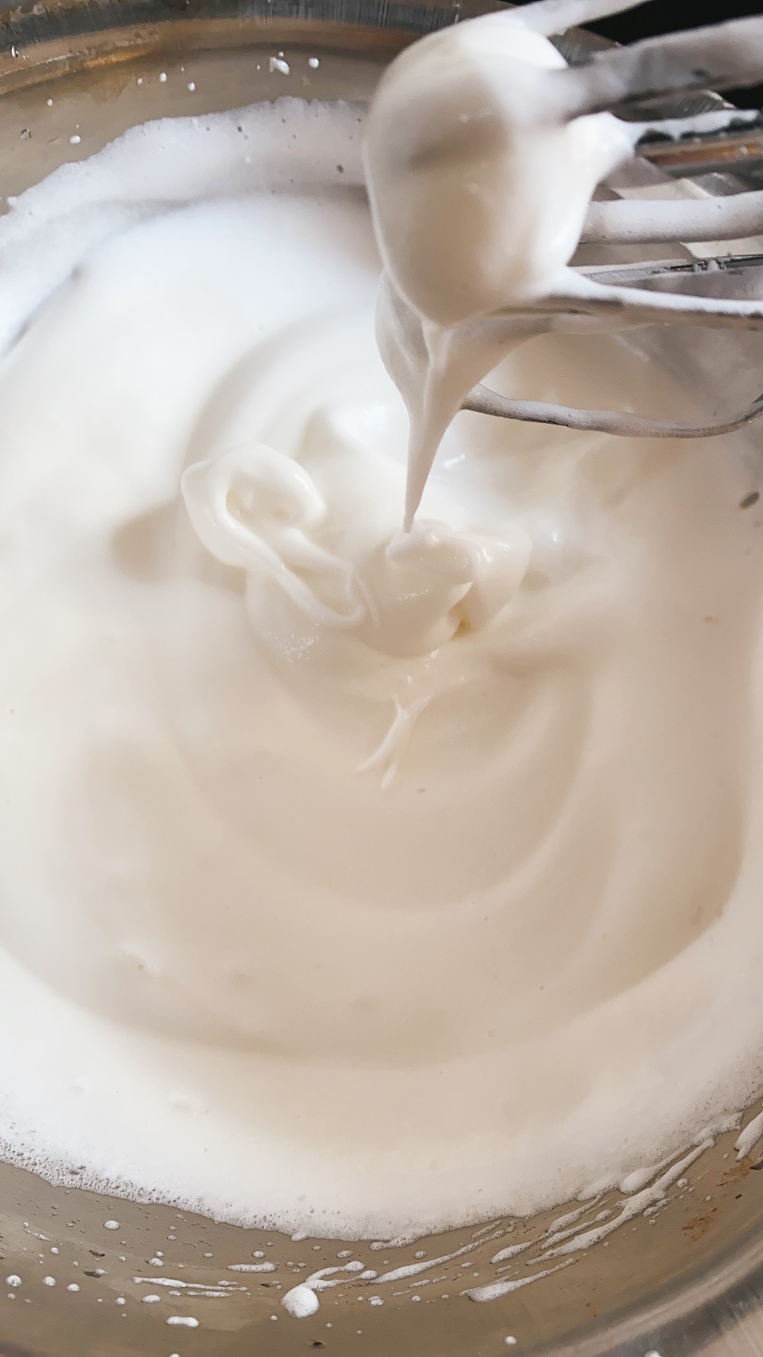 步骤8、四个蛋白中加入几滴柠檬汁,分三次加入45g白砂糖打发(提起是大弯钩的干性发泡,不要过度打发)。