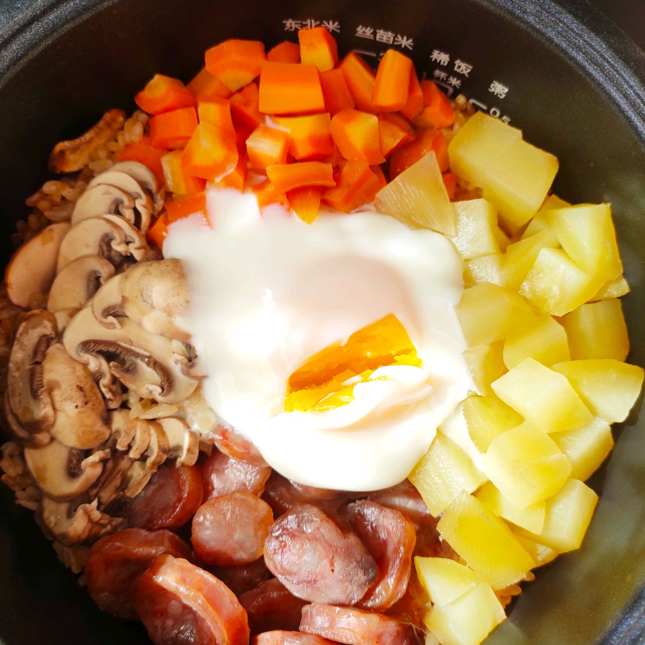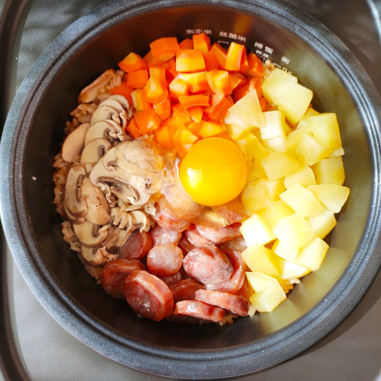 步骤1、大米淘洗好,泡15分钟,腊肠、胡萝卜、土豆、口蘑都切好