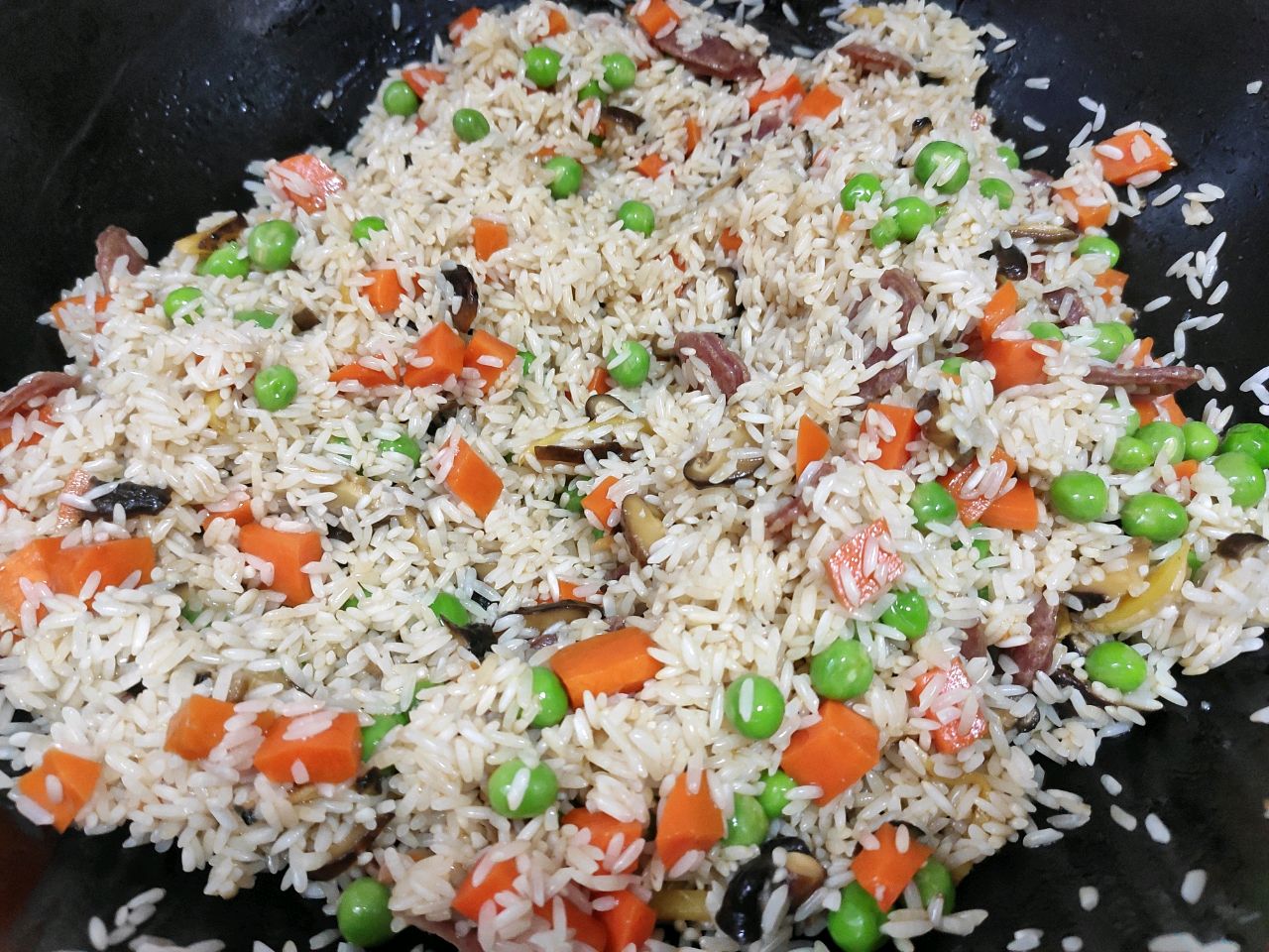 步骤7、下入胡萝卜丁,香菇丝,青豆一起翻炒2分钟。