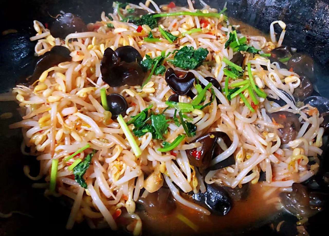 步骤8、黄豆芽郫县豆瓣酱炒匀放入木耳一起炒