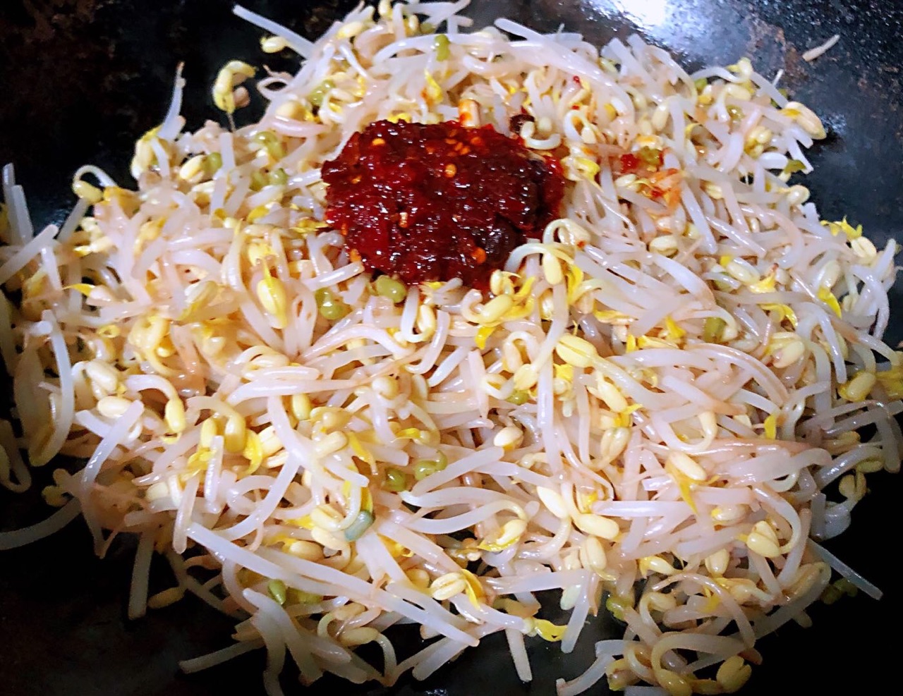 步骤7、放入黄豆芽同时放入这道美味的灵魂调味料郫县豆瓣酱