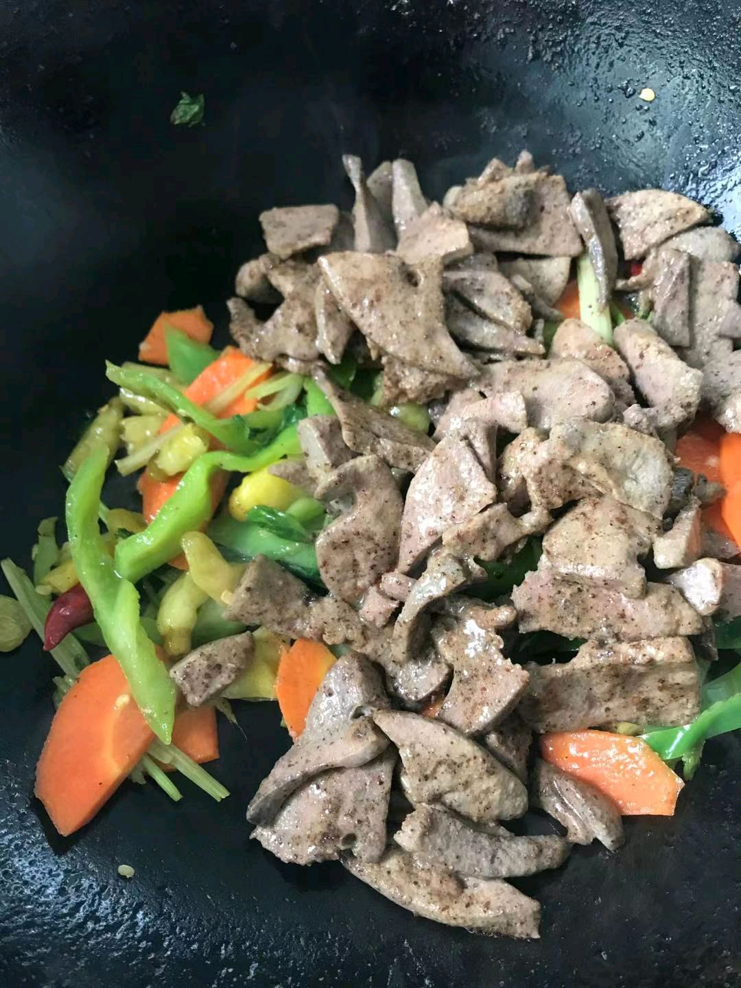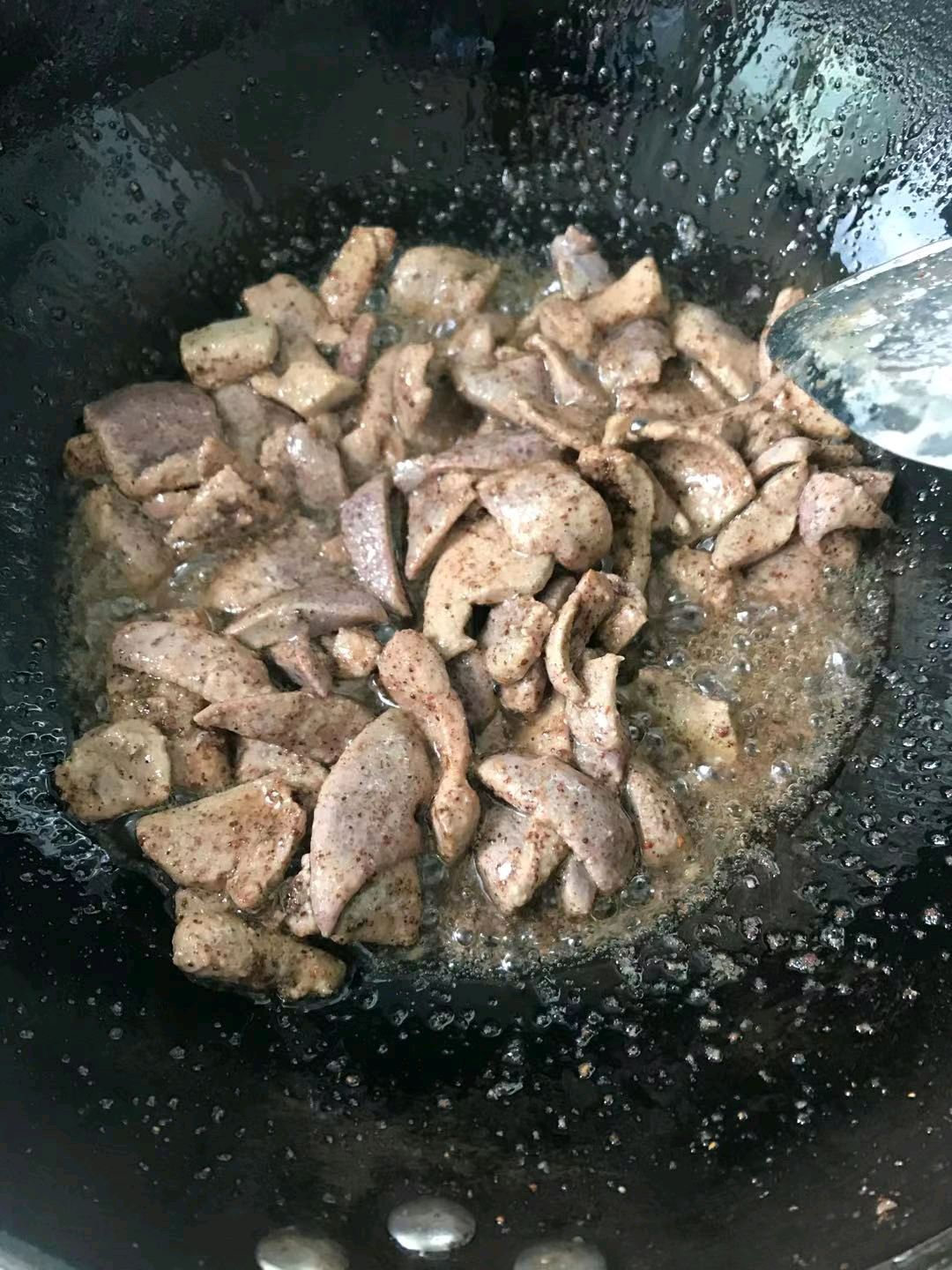 辅料:猪肝一块、青椒1个、姜一片、料酒少量、淀粉少量、泡椒