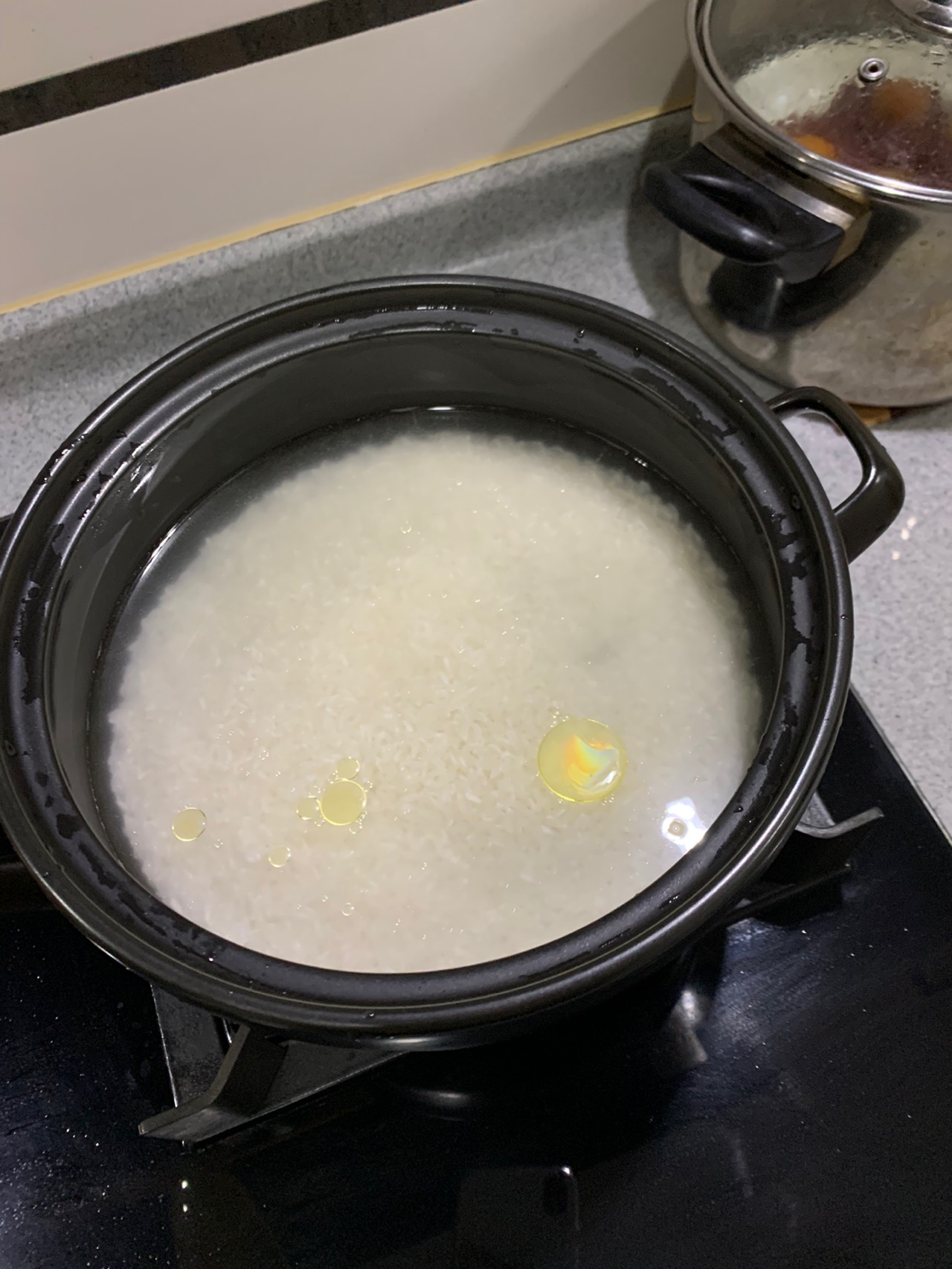 步骤2、米淘洗干净,加两滴油,大火开煮。