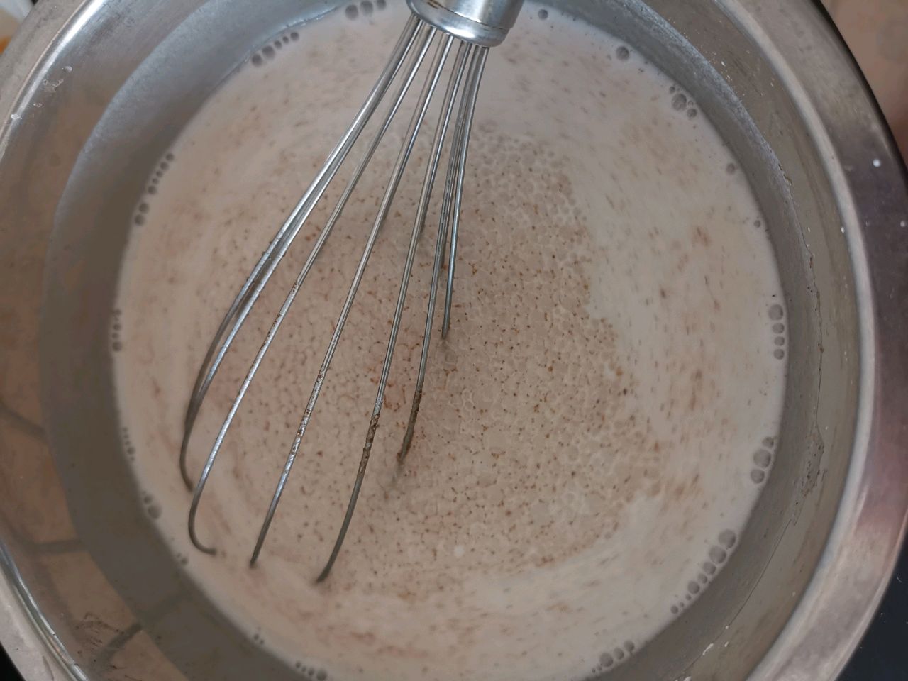步骤5、关火,倒入粘米粉浆,快速搅拌均匀。