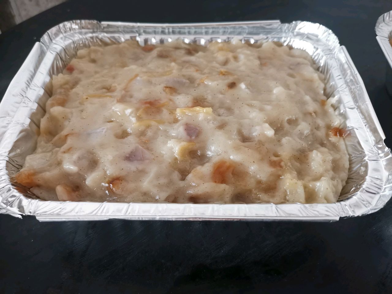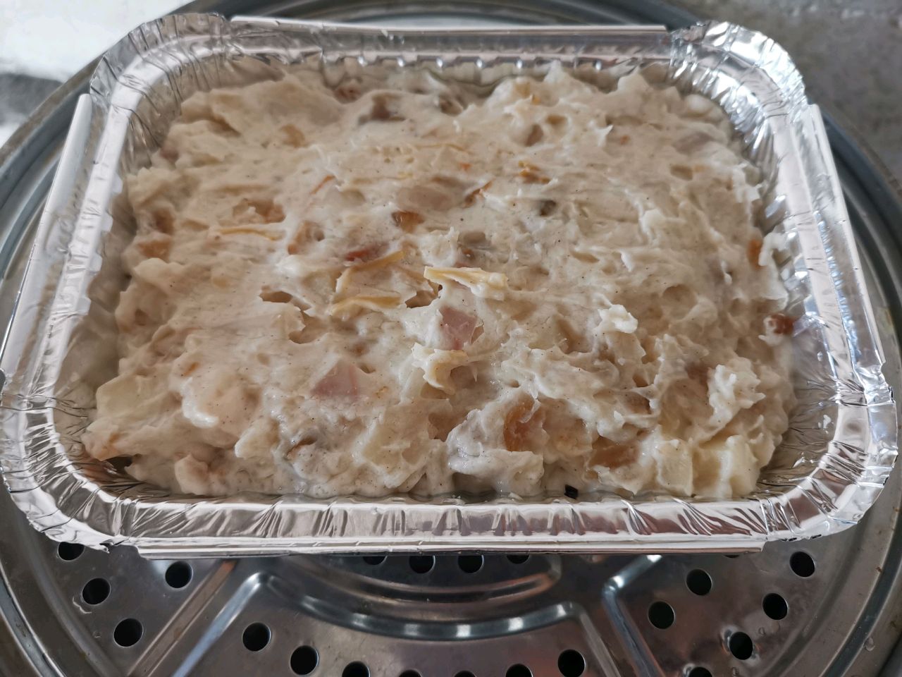 辅料:粘米粉180克、海米50克、水500克、盐适量、五香粉适量、腊肉适量、干贝适量