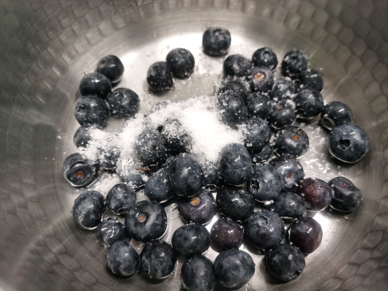 步骤1、先熬蓝莓酱,没什么特别的就是加了白糖和水,超市里的一盒蓝莓正好吃一次,熬15到20分钟要来回搅以免粘锅,熬好后晾凉备用