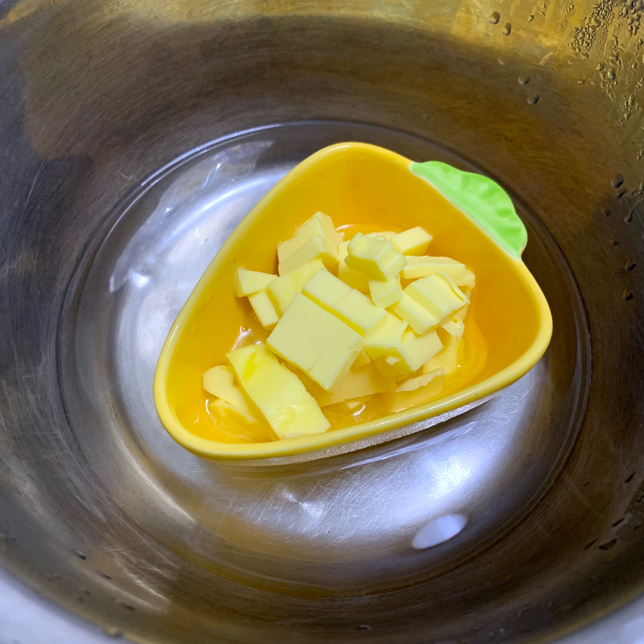 步骤7、泡好的吉利丁片挤干水分,放入牛奶中,隔热水融化