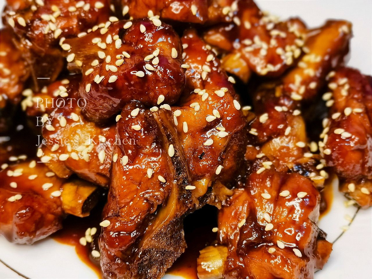 辅料:大葱2段、料酒2勺、太太乐糖醋排骨调味料一包、白芝麻适量