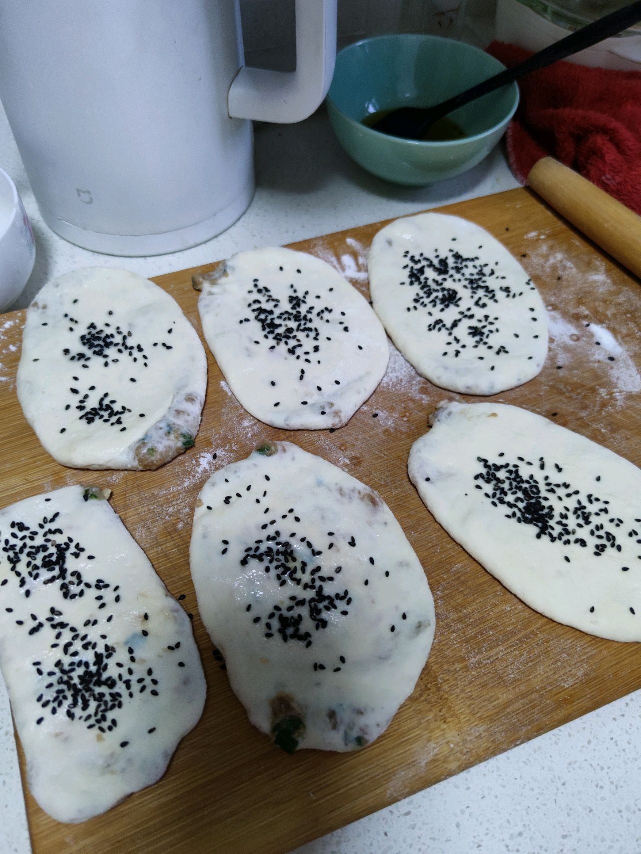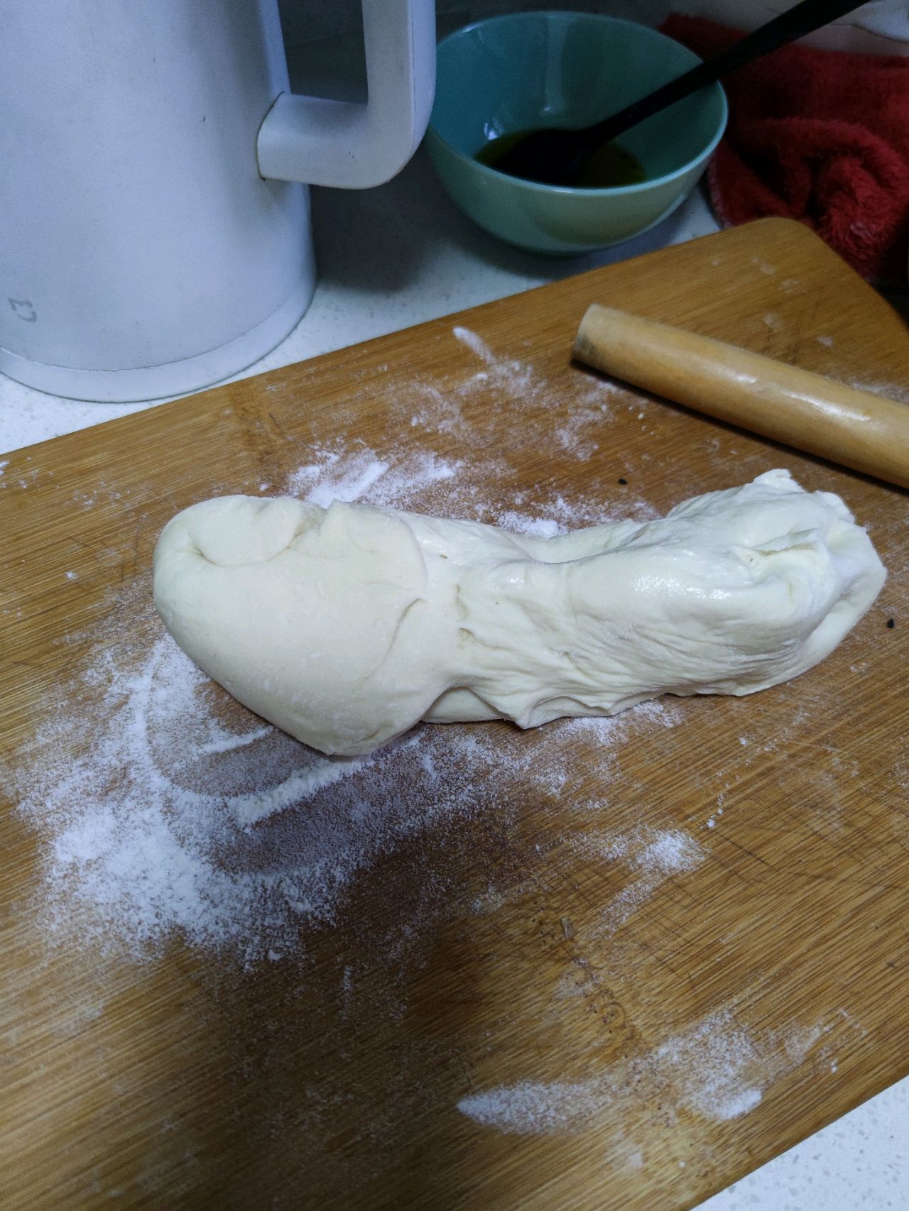 步骤5、把放入馅料的饼包起来,擀面杖擀成这个样子