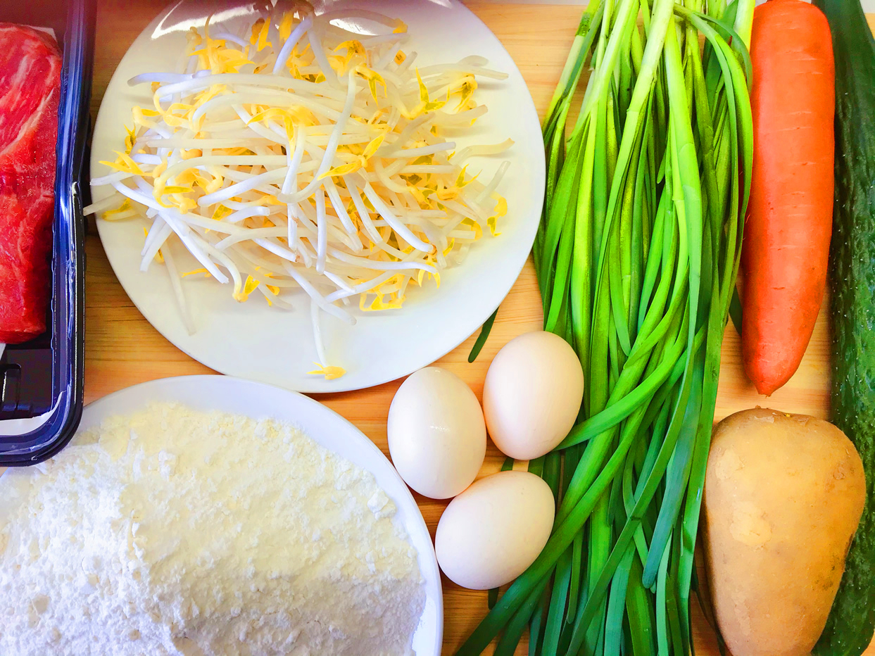 辅料:色拉油10ml、盐1g、鸡蛋3个、胡萝卜1根、黄瓜1根、土豆1个、瘦肉150g、韭菜100g、绿豆芽100g、姜5g、干辣椒3个、盐3g、花生油30ml、生抽10ml、料酒10ml