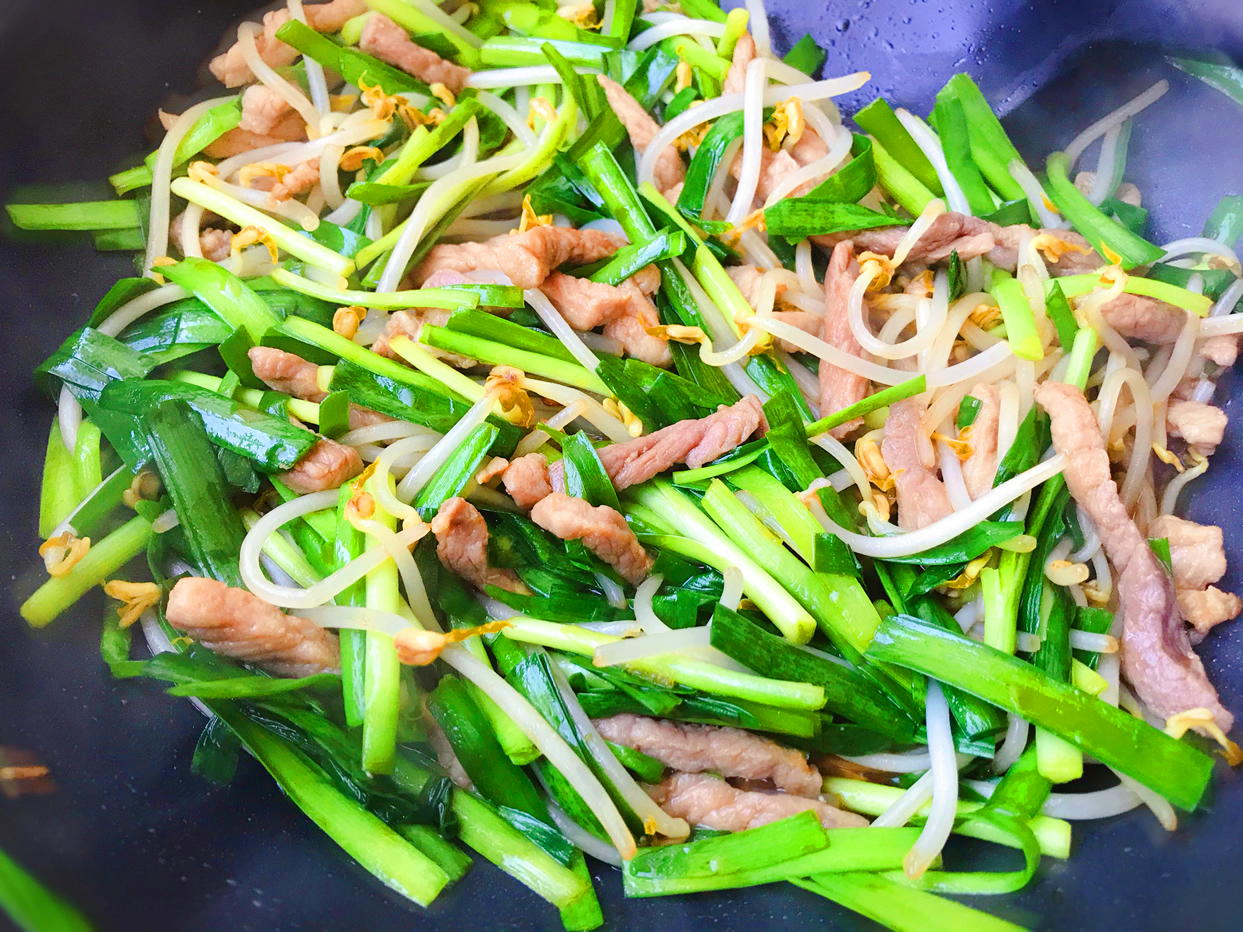步骤12、倒入切好的韭菜段翻炒,然后撒入盐调味,翻炒均匀即可出锅装盘。