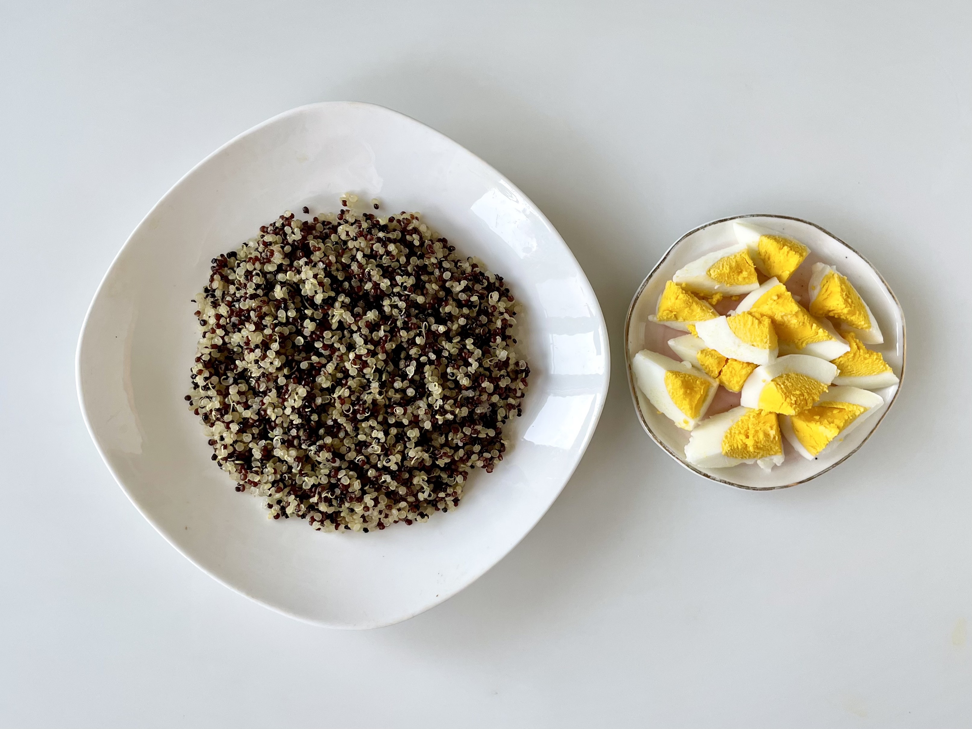 步骤1、三色藜麦洗净用清水浸泡1小时,然后沥干水分,放入蒸箱或蒸锅,蒸15分钟,把藜麦蒸熟,同时把鸡蛋也蒸熟,切成小块备用。