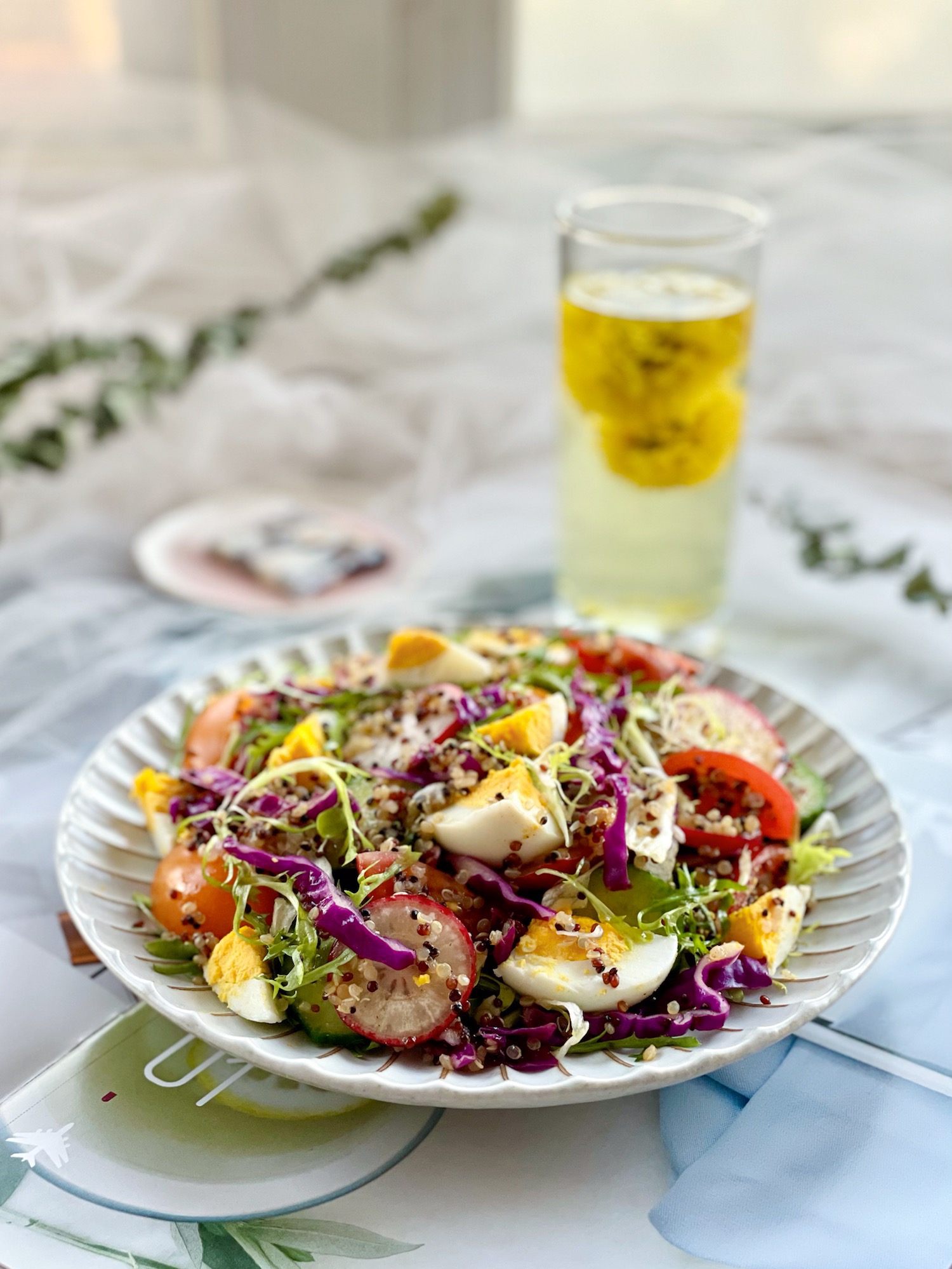 辅料:圣女果6个、樱桃萝卜2个、黄瓜1/3根、苦菊1小把、圆生菜3片、紫甘蓝3片、油醋汁配方:橄榄油1勺,黑醋1勺,生抽1勺,蜂蜜1勺,黑胡椒粉适量