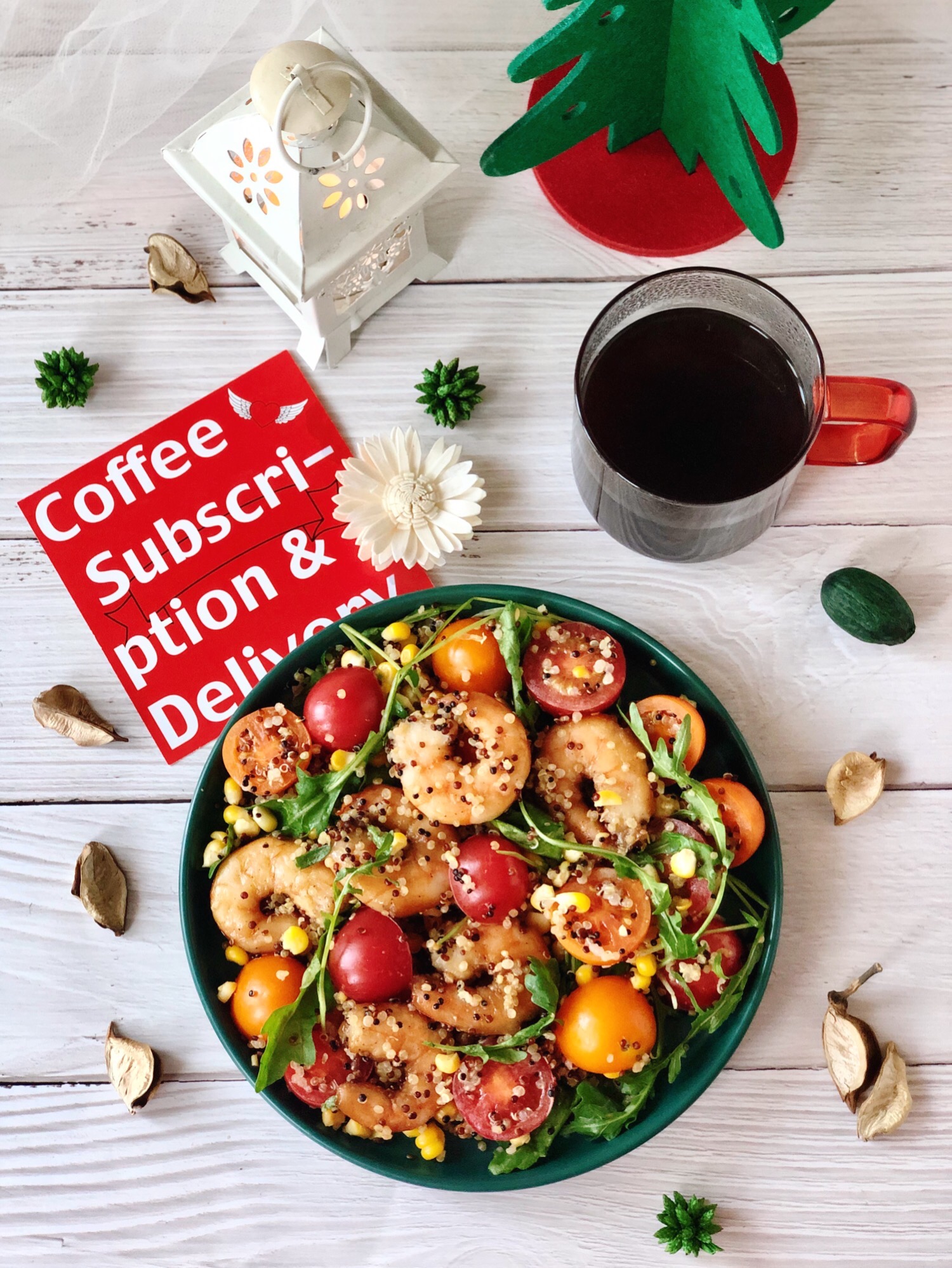 步骤6、把熟藜麦、玉米粒、烤虾仁、圣女果、芝麻菜一起放入料理豌。