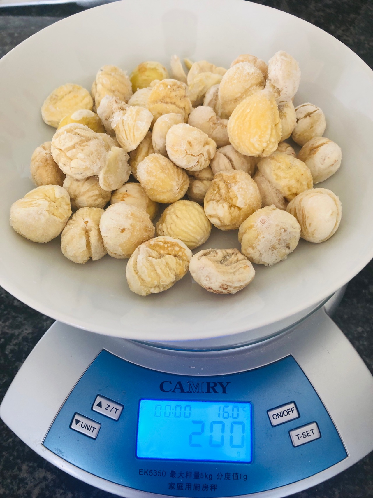 步骤2、取200克上锅蒸10分钟左右就熟了(蒸熟的没那么多水份哈)。用擀面杖或者任意高招儿捣烂就成。我喜欢栗子有点小碎粒的口感。
