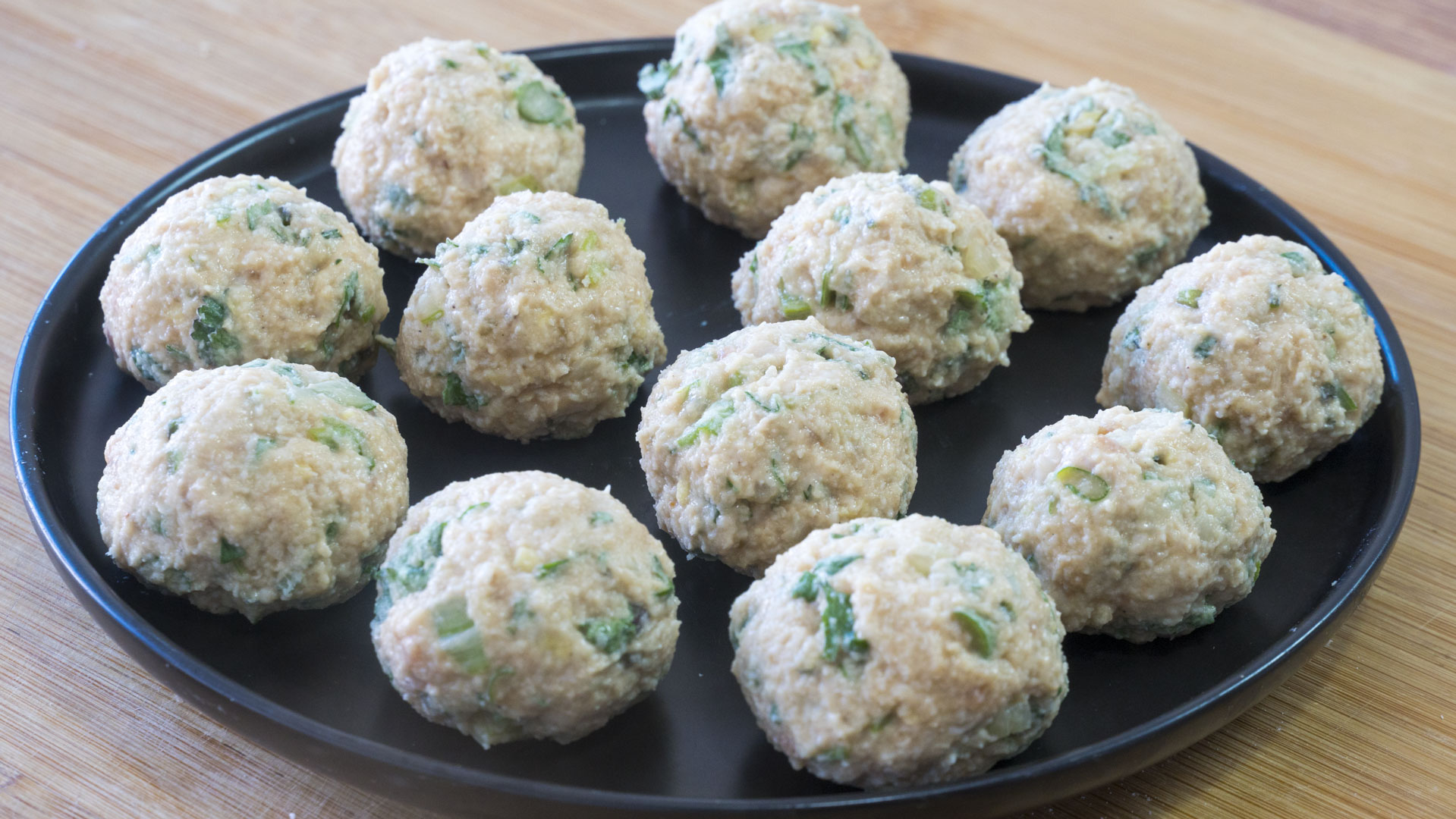 步骤10、下面我们就可以开始捏丸子了,取一小坨肉馅儿捏紧后搓一搓,丸子就做好了,大小随意,只是小丸子比较好炸熟,大丸子时间会久一些;